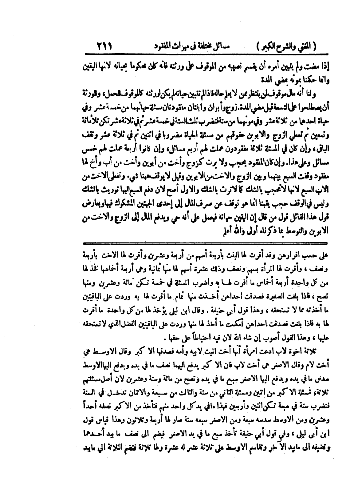 ثلاثة اخوة لأب ادعت امرأة أنها أخت الميت لأبيه وأمه فصدقها الأكبر وقال الأوسط هي أخت لأم وقال الأصغر هي أخت لأب فإن الاكبر يدفع إليهما نصف ما في يده ويدفع إليها الأوسط سدس ما في يده ويدفع إليها الأصغر سبع ما في يده وتصح من مائة وستة وعشرين لان أصل مسئلتهم ثلاثة، فمسألة الأكبر من اثنين ومسألة الثاني من ستة والثالث من سبعة والاثنان تدخل في الستة فتضرب ستة في سبعة تكن اثنين وأربعين فهذا ما في يد كل واحد منهم فتأخذ من الأكبر نصفه أحداً وعشرين ومن الأوسط سدسه سبعة ومن الأصغر سبعه ستة صار لها أربعة وثلاثون وهذا قياس قول ابن أبي ليلى، وفي قول أبي حنيفة تأخذ سبع ما في يد الأصغر فيضم إلى نصف ما بيد أحدهما وتضيفه إلى ما بيد الآخر وتقاسم الأوسط على ثلاثة عشر له عشرة ولها ثلاثة فتضم الثلاثة إلى ما بيد