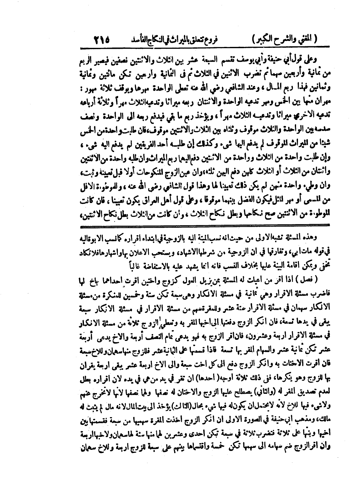 وهذه المسألة تشبه الأولى من حيث أنه نسب الميتة إليه بالزوجية في ابتداء إقراره كما نسب الأبوة إليه في قوله مات ابي وتفارقها في أن الزوجية من شرطها الاشهاد، ويستحب الإعلان بها وإشهارها فلا تكاد تخفى ويمكن إقامة البينة عليها بخلاف النسب فإنه إنما يشهد عليه بالاستفاضة غالباً (فصل) إذا أقر من اعيلت له المسألة بمن يزيل العول كزوج وأختين أقرت إحداهما بأخ لها فاضرب مسألة الاقرار وهي ثمانية في مسألة الإنكار وهي سبعة تكن ستة وخمسين للمنكرة من مسألة الإنكار سهمان في مسألة الإقرار ستة عشر وللمقرة سهم من مسألة الإقرار في مسألة الإنكار سبعة يبقى في يدها تسعة، فإن أنكر الزوج دفعتها إلى أخيها المقر به وتعطي الزوج ثلاثة من مسألة الإنكار في مسألة الإقرار أربعة وعشرون، فإن أقر الزوج به فهو يدعي تمام النصف أربعة والأخ يدعي أربعة عشر تكن ثمانية عشر والسهام المقر بها تسعة فإذا قسمتها على الثمانية عشر فللزوج منها سهمان وللأخ سبعة فان اقرت الاختات به وأنكر الزوج دفع إلى كل أخت سبعة وإلى الأخ أربعة عشر يبقى أربعة يقران بها للزوج وهو ينكرها، ففي ذلك ثلاثة أوجه (أحدها) أن تقر في يد من هي في يده لأن إقراره بطل لعدم تصديق المقر له (والثاني) يصطلح عليها الزوج والأختان له نصفها ولهما نصفها لأنها لا تخرج عنهم ولا شئ فيها للأخ لأنه لا يحتمل أن يكون له فيها شئ بحال (الثالث) يؤخذ الى بيت المال لأنه مال لم يثبت له مالك، ومذهب أبي حنيفة في الصورة الأولى إن أنكر الزوج أخذت المقرة سهميها من سبعة فقسمتها بين أخيها وبنتها على ثلاثة فتضرب ثلاثة في سبعة تكن إحدى وعشرين لهما منها ستة لها سهمان ولأخيها أربعة