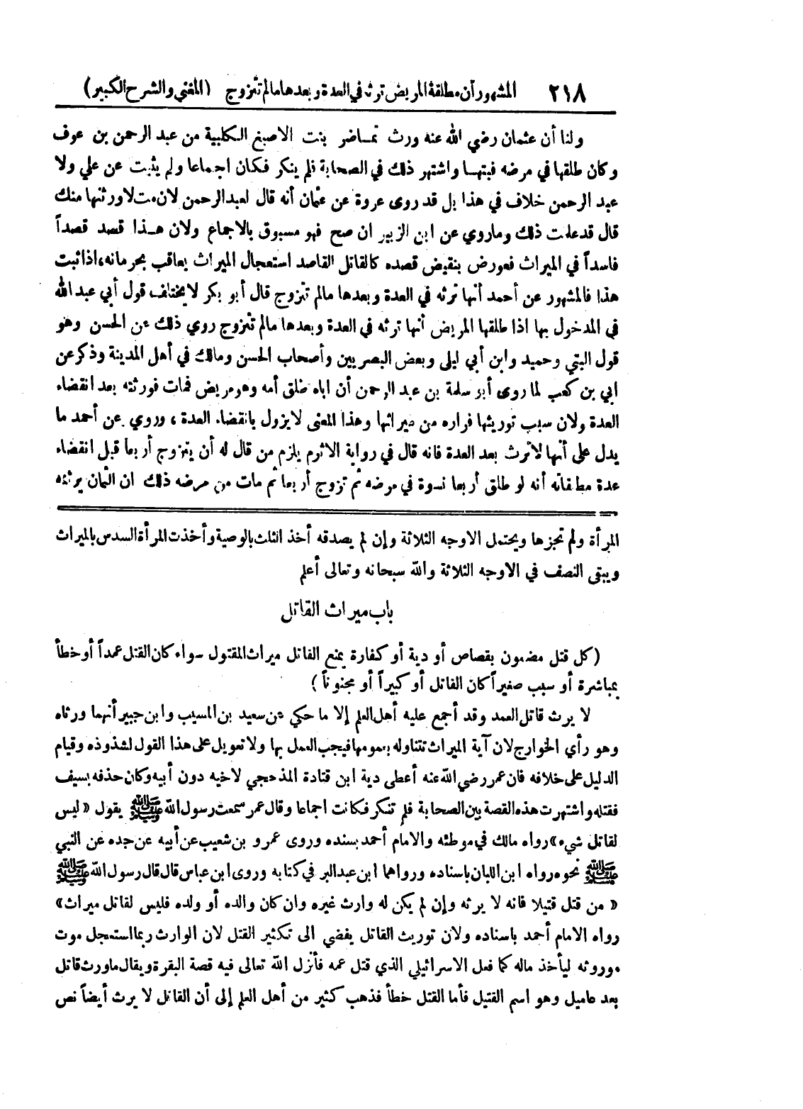 المرأة ولم تجزها ويحتمل الأوجه الثلاثة وإن لم يصدقه أخذ الثلث بالوصية وأخذت المرأة السدس بالميراث ويبقى النصف في الأوجه الثلاثة والله سبحانه وتعالى أعلم باب ميراث القاتل (كل قتل مضمون بقصاص أو دية أو كفارة يمنع القاتل ميراث المقتول سواء كان القتل عمداً أو خطأ بمباشرة أو سبب صغيراً كان القاتل أو كبيراً أو مجنوناً) لا يرث قاتل العمد وقد أجمع عليه أهل العلم إلا ما حكي عن سعيد بن المسيب وابن جبير أنهما ورثاه وهو رأي الخوارج لأن آية الميراث تتناوله بعمومها فيجب العمل بها ولا تعويل على هذا القول لشذوذه وقيام الدليل على خلافه فإن عمر رضي الله عنه أعطى دية ابن قتادة المذحجي لأخيه دون أبيه وكان حذفه بسيف فقتله واشتهرت هذه القصة بين الصحابة فلم تنكر فكانت إجماعاً وقال عمر سمعت رسول الله صلى الله عليه وسلم يقول " ليس لقاتل شئ " رواه مالك في موطئه والإمام أحمد بسنده وروى عمرو بن شعيب عن أبيه عن جده عن النبي