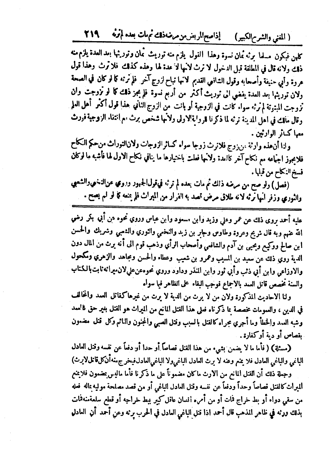 عليه أحمد يروي ذلك عن عمر وعلي وزيد وابن مسعود وابن عباس وروي نحوه عن أبي بكر رضي الله عنهم وبه قال شريح وعروة وطاوس وجابر بن زيد والنخعي والثوري والشعبي وشريك والحسن ابن صالح ووكيع ويحيى بن آدم والشافعي وأصحاب الرأي وذهب قوم إلى أنه يرث من المال دون الدية روى ذلك عن سعيد بن المسيب وعمرو بن شعيب وعطاء والحسن ومجاهد والزهري ومكحول والاوزاعي وابن أبي ذئب وأبي ثور وابن المنذر وداود وروي نحوه عن علي لان ميراثه ثابت بالكتاب والسنة تخصص قاتل العمد بالإجماع فوجب البقاء على الظاهر فيما سواه ولنا الأحاديث المذكورة ولأن من لا يرث من الدية لا يرث من غيرها كقاتل العمد والمخالف في الدين، والعمومات مخصصة بما ذكرناه فعلى هذا القتل المانع من الميراث هو القتل بغير حق كالعمد وشبه العمد والخطأ وما أجري مجراه كالقتل بالسبب وقتل الصبي والمجنون والنائم وكل قتل مضمون بقصاص أو دية أو كفارة.