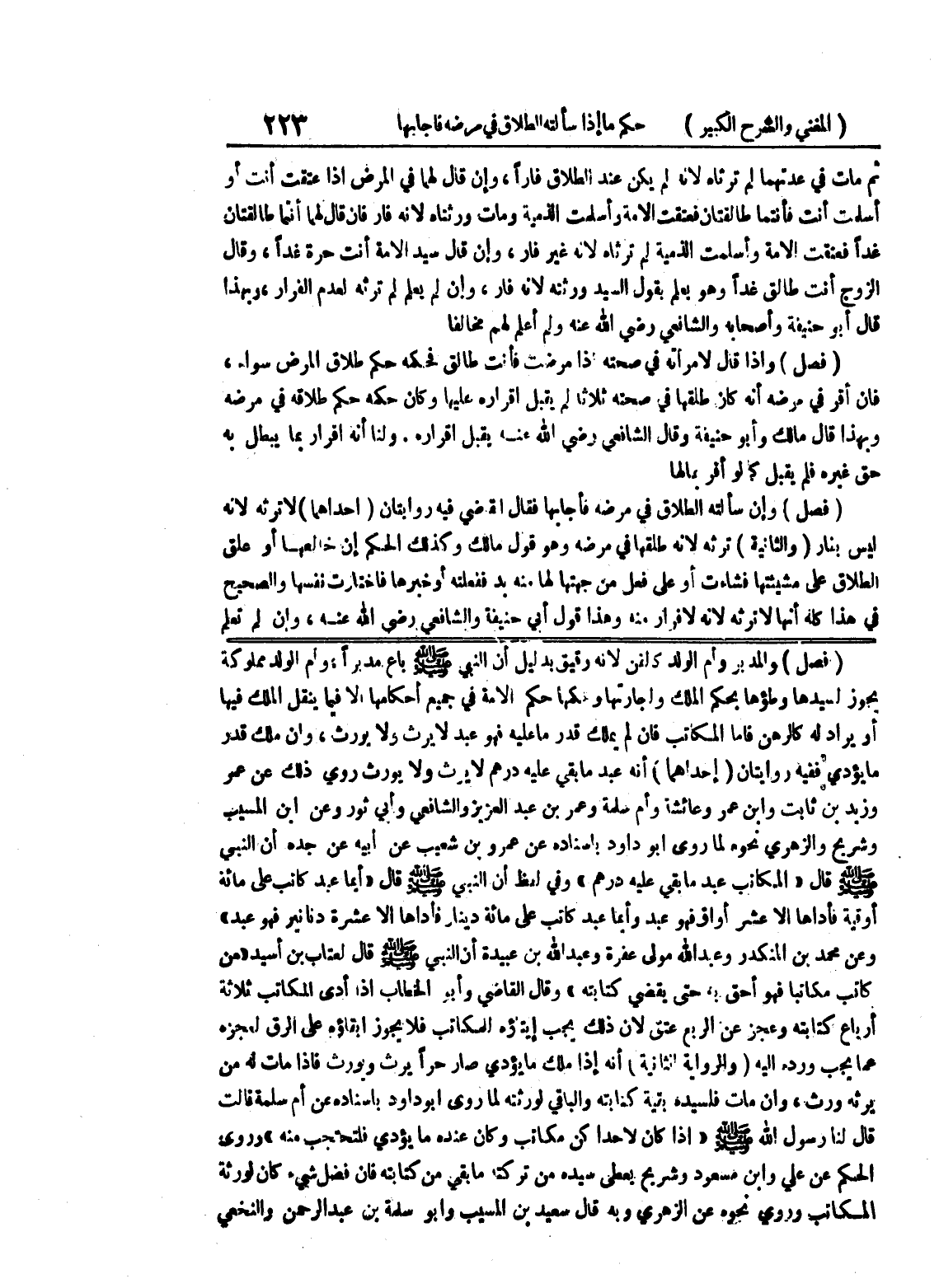 (فصل) والمدبر وأم الولد كلفن لأنه رقيق بدليل أن النبي صلى الله عليه وسلم باع مدبراً، وأم الولد مملوكة يجوز لسيدها وطؤها بحكم الملك وإجارتها وحكمها حكم الأمة في جميع أحكامها إلا فيما ينقل الملك فيها أو يراد له كالرهن فأما المكاتب فإن لم يملك قدر ما عليه فهو عبد لا يرث ولا يورث، وإن ملك قدر ما يؤدي ففيه روايتان (إحداهما) أنه عبد ما بقي عليه درهم لا يرث ولا يورث روى ذلك عن عمر وزيد بن ثابت وابن عمر وعائشة وأم سلمة وعمر بن عبد العزيز والشافعي وأبي ثور وعن ابن المسيب وشريح والزهري نحوه لما روى أبو داود بإسناده عن عمرو بن شعيب عن أبيه عن جده أن النبي صلى الله عليه وسلم قال " المكاتب عبد ما بقي عليه درهم " وفي لفظ أن النبي صلى الله عليه وسلم قال " أيما عبد كاتب على مائة أوقية فأداها إلا عشر أواق فهو عبد وأيما عبد كاتب على مائة دينار فأداها إلا عشرة دنانير فهو عبد " وعن محمد بن المنكدر وعبد الله مولى عفرة وعبد الله بن عبيدة أن النبي صلى الله عليه وسلم قال لعتاب بن أسيد " من كاتب مكاتباً فهو أحق به حتى يقضي كتابته " وقال القاضي وابو الخطاب إذا أدى المكاتب ثلاثة أرباع كتابته وعجز عن الربع عتق لأن ذلك يجب إيتاؤه للمكاتب فلا يجوز إبقاؤه على الرق لعجزه عما يجب ورده إليه (والرواية الثانية) أنه إذا ملك ما يؤدي صار حراً يرث ويورث فإذا مات له من يرثه ورث، وإن مات فلسيده بقية كتابته والباقي لورثته لما روى أبو داود بإسناده عن أم سلمة قالت قال لنا رسول الله صلى الله عليه وسلم " إذا كان لإحداكن مكاتب وكان عنده ما يؤدي فلتحتجب منه " وروى الحكم عن علي وابن مسعود وشريح يعطى سيده من تركته ما بقي من كتابته فإن فضل شئ كالورثة