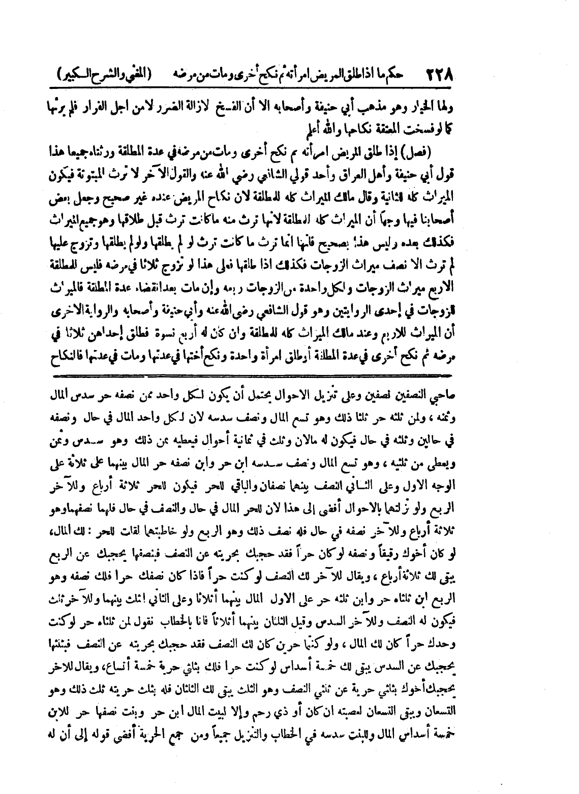 صاحبي النصفين نصفين وعلى تنزيل الأحوال يحتمل أن يكون لكل واحد ممن نصفه حر سدس المال وثمنه، ولمن ثلثه حر ثلثا ذلك وهو تسع المال ونصف سدسه لأن لكل واحد المال في حال ونصفه في حالين وثلثه في حال فيكون له مالان وثلث في ثمانية أحوال فيعطيه ثمن ذلك وهو سدس وثمن ويعطى من ثلثيه، وهو تسع المال ونصف سدسه ابن حر وابن نصفه حر المال بينهما على ثلاثة على الوجه الأول وعلى الثاني النصف بينهما نصفان والباقي للحر فيكون للحر ثلاثة أرباع وللآخر الربع ولو نزلتهما بالأحوال أفضى إلى هذا لأن للحر المال في حال والنصف في حال فلهما نصفهما وهو ثلاثة أرباع وللآخر نصفه في حال فله نصف ذلك وهو الربع ولو خاطبتهما لقلت للحر: لك المال، لو كان أخوك رقيقاً ونصفه لو كان حراً فقد حجبك بحريته عن النصف فبنصفها يحجبك عن الربع يبقى لك ثلاثة أرباع، ويقال للآخر لك النصف لو كنت حراً فإذا كان نصفك حراً فلك نصفه وهو الربع ابن ثلثاه حر وابن ثلثه حر على الأول المال بينهما أثلاثاً وعلى الثاني الثلث بينهما وللآخر ثلث فيكون له النصف وللآخر السدس وقيل الثلثان بينهما أثلاثاً فأنا بالخطاب نقول لمن ثلثاه حر لو كنت وحدك حراً كان لك المال، ولو كنتما حرين كان لك النصف فقد حجبك بحريته عن النصف فبثلثها يحجبك عن السدس يبقى لك خمسة أسداس لو كنت حراً فلك بثلثي حرية خمسة أتساع، ويقال للآخر يحجبك أخوك بثلثي حرية عن ثلثي النصف وهو الثلث يبقى لك الثلثان فله بثلث حريته ثلث ذلك وهو التسعان ويبقى التسعان لعصبته إن كان أو ذي رحم وإلا لبيت المال ابن حر وبنت نصفها حر للابن خمسة أسداس المال وللبنت سدسه في الخطاب والتنزيل جميعاً ومن جمع الحرية أفضى قوله إلى أن له