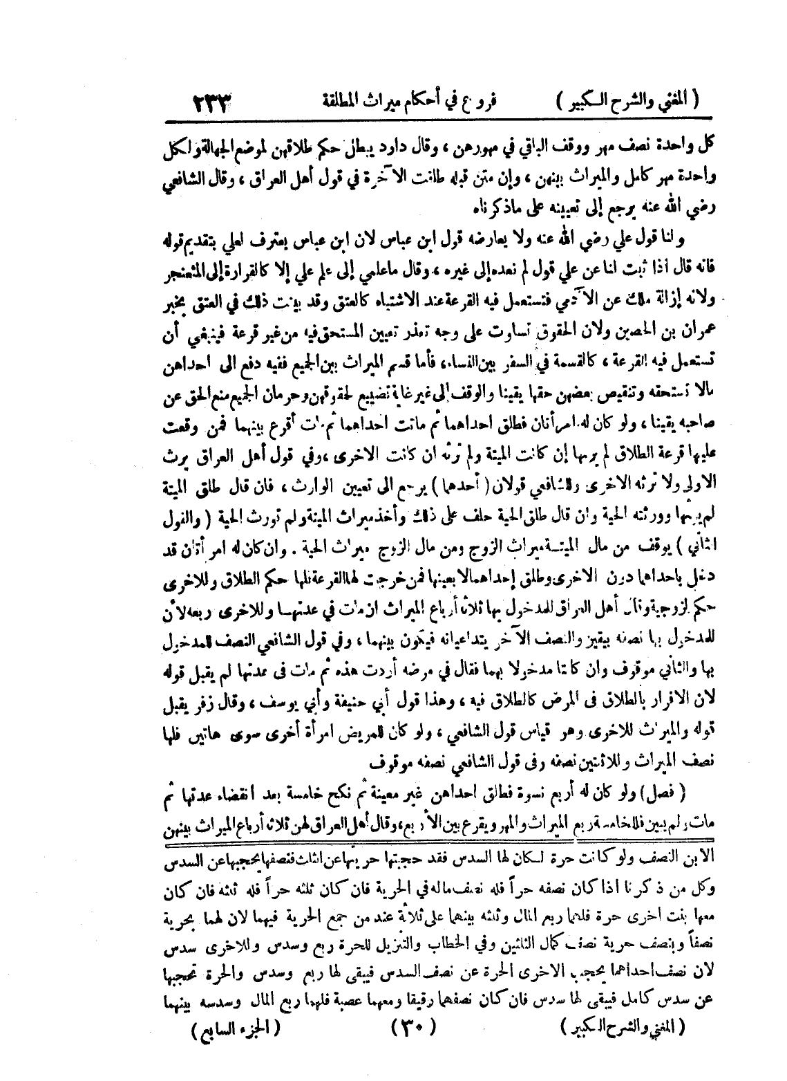 الابن النصف ولو كانت حرة لكان لها السدس فقد حجبتها حريتها عن الثلث فنصفها يحجبها عن السدس وكل من ذكرنا إذا كان نصفه حرا فله نصف ماله في الحرية فإن كان ثلثه حراً فله ثلثه فان كان معها بنت أخرى حرة فلهما ربع المال وثلثه بينهما على ثلاثة عند من جمع الحرية فيهما لأن لهما بحرية نصفاً وبنصف حرية نصف كمال الثلثين وفي الخطاب والتنزيل للحرة ربع وسدس وللأخرى سدس لأن نصف إحداهما يحجب الأخرى الحرة عن نصف السدس فيبقى لها ربع وسدس والحرة تحجبها عن سدس كامل فيبقى لها سدس فإن كان نصفهما رقيقاً ومعهما عصبة فلهما ربع المال وسدسه بينهما