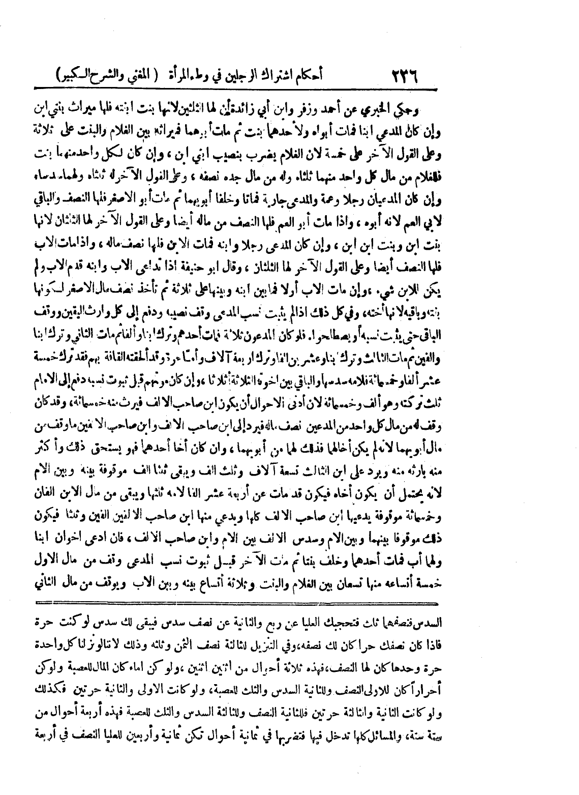 السدس فنصفهما ثلث فتحجبك العليا عن ربع والثانية عن نصف سدس فيبقى لك سدس لو كنت حرة فإذا كان نصفك حرا كان لك نصفه، وفي التنزيل للثالثة نصف الثمن وثلثه وذلك لأننا لو نزلنا كل واحدة حرة وحدها كان لها النصف، فهذه ثلاثة أحوال من اثنين اثنين، ولو كن إماء كان المال للعصبة ولو كن أحراراً كان للأولى النصف وللثانية السدس والثلث للعصبة، ولو كانت الأولى والثانية حرتين فكذلك ولو كانت الثانية والثالثة حرتين فللثانية النصف وللثالثة السدس والثلث للعصبة فهذه أربعة أحوال من ستة ستة، والمسائل كلها تدخل فيها فتضربها في ثمانية أحوال تكن ثمانية وأربعين للعليا النصف في أربعة
