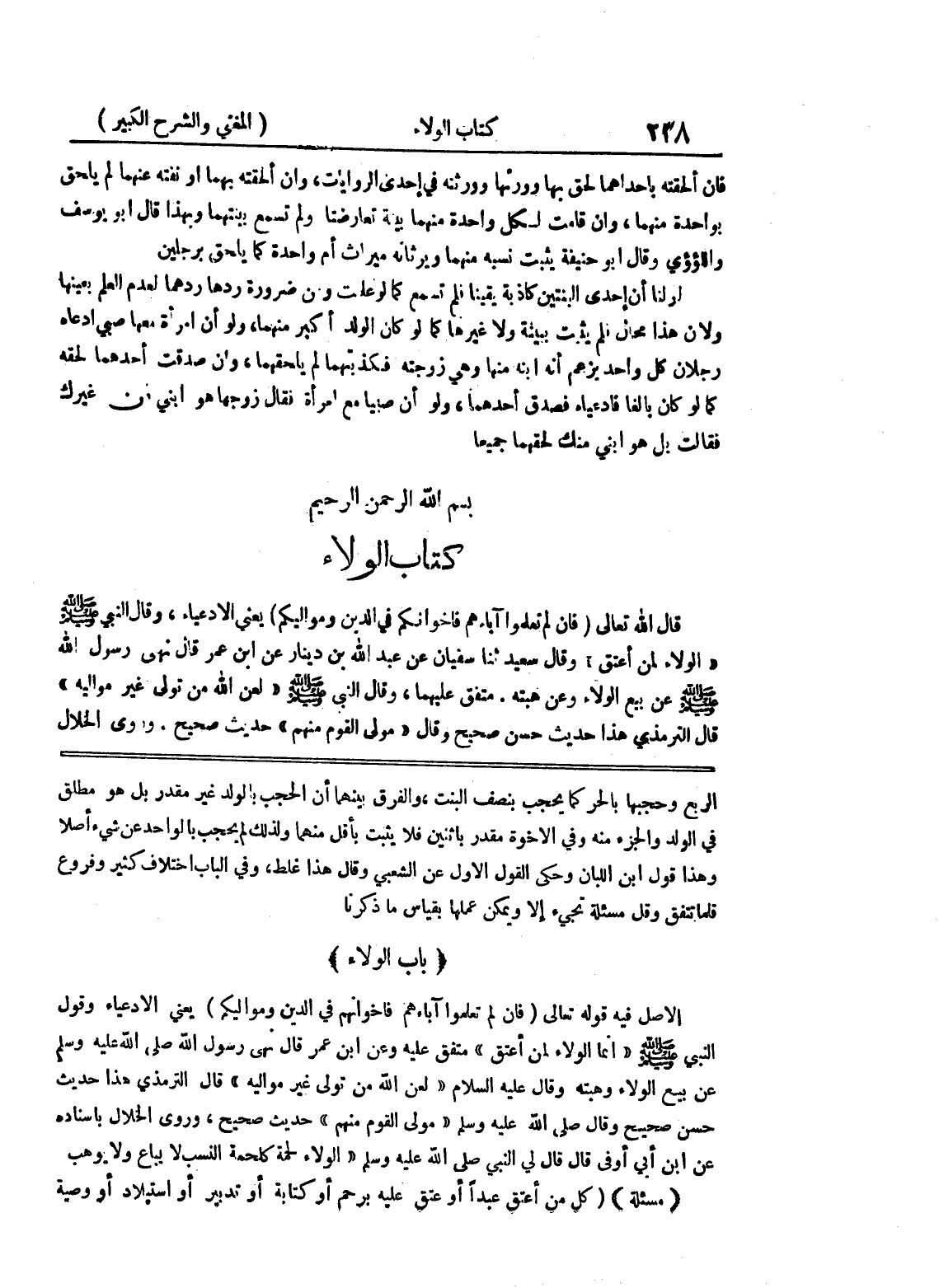 الربع وحجبها بالحر كما يحجب بنصف البنت، والفرق بينهما أن الحجب بالولد غير مقدر بل هو مطلق في الولد والجزء منه وفي الاخوة مقدر باثنين فلا يثبت بأقل منهما ولذلك لم يحجب بالواحد عن شئ أصلا وهذا قول ابن اللبان وحكى القول الأول عن الشعبي وقال هذا غلط، وفي الباب اختلاف كثير وفروع قلما تتفق وقل مسألة تجئ إلا ويمكن عملها بقياس ما ذكرنا (باب الولاء) الأصل فيه قوله تعالى (فإن لم تعلموا آباءهم فاخوانهم في الدين ومواليكم) يعني الأدعياء وقول النبي صلى الله عليه وسلم " إنما الولاء لمن أعتق " متفق عليه وعن ابن عمر قال نهى رسول الله صلى الله عليه وسلم عن بيع الولاء وهبته وقال عليه السلام " لعن الله من تولى غير مواليه " قال الترمذي هذا حديث حسن صحيح وقال صلى الله عليه وسلم " مولى القوم منهم " حديث صحيح، وروى الخلال بإسناده عن ابن أبي أوفى قال قال لي النبي صلى الله عليه وسلم " الولاء لحمة كلحمة النسب لا يباع ولا يوهب (مسألة) (كل من أعتق عبداً أو عتق عليه برحم أو كتابة أو تدبير أو استيلاد أو وصية
