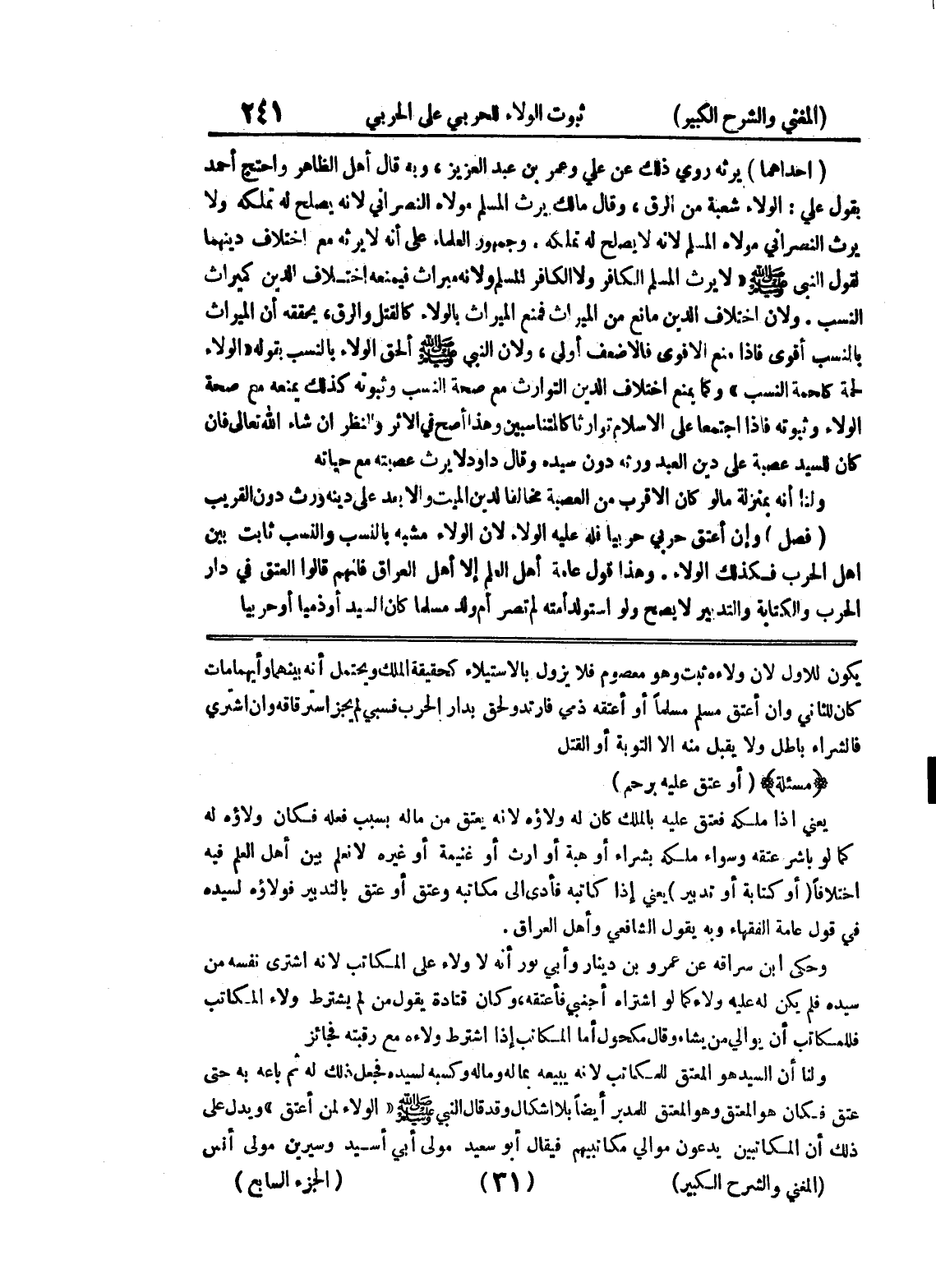 يكون للأول لأن ولاءه ثبت وهو معصوم فلا يزول بالاستيلاء كحقيقة الملك ويحتمل أنه بينهما وأيهما مات كان للثاني وإن أعتق مسلم مسلماً أو أعتقه ذمي فارتد ولحق بدار الحرب فسبي لم يجز استرقاقه وإن اشتري فالشراء باطل ولا يقبل منه إلا التوبة أو القتل (مسألة) (أو عتق عليه برحم) يعني إذا ملكه فعتق عليه بالملك كان له ولاؤه لأنه يعتق من ماله بسبب فعله فكان ولاؤه له كما لو باشر عتقه وسواء ملكه بشراء أو هبة أو إرث أو غنيمة أو غيره لا نعلم بين أهل العلم فيه اختلافاً (أو كتابة أو تدبير) يعني إذا كاتبه فأدى إلى مكاتبه وعتق أو عتق بالتدبير فولاؤه لسيده في قول عامة الفقهاء وبه يقول الشافعي وأهل العراق.