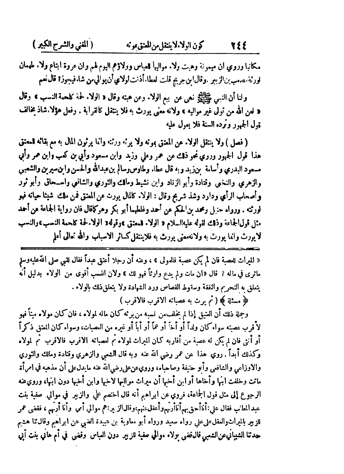 روي هذا عن عمر رضي الله عنه وبه قال الشعبي والزهري وقتادة ومالك والثوري والاوزاعي والشافعي وأبو حنيفة وصاحباه، وروي عن علي رضي الله عنه ما يدل على أن مذهبه في امرأة ماتت وخلفت ابنها وأخاها أو ابن أخيها أن ميراث مواليها لأخيها وابن أخيها دون ابنها، وروي عنه الرجوع إلى مثل قول الجماعة، فوري عن إبراهيم أنه قال اختصم علي والزبير في موالي صفية بنت عبد المطلب فقال علي: أنا أحق بهم أنا أرثهم وأعقل عنهم، وقال الزبير: هم موالي أمي وأنا أرثهم، فقضى عمر للزبير بالميراث والعقل على علي رواه سعيد ورواه أبو معاوية بن عبيدة الضبي عن ابراهيم وقال ثنا هشيم حدثنا الشيباني عن الشعبي قال قضى بولاء موالي صفية للزبير دون العباس وقضى في أم هاني بنت أبي