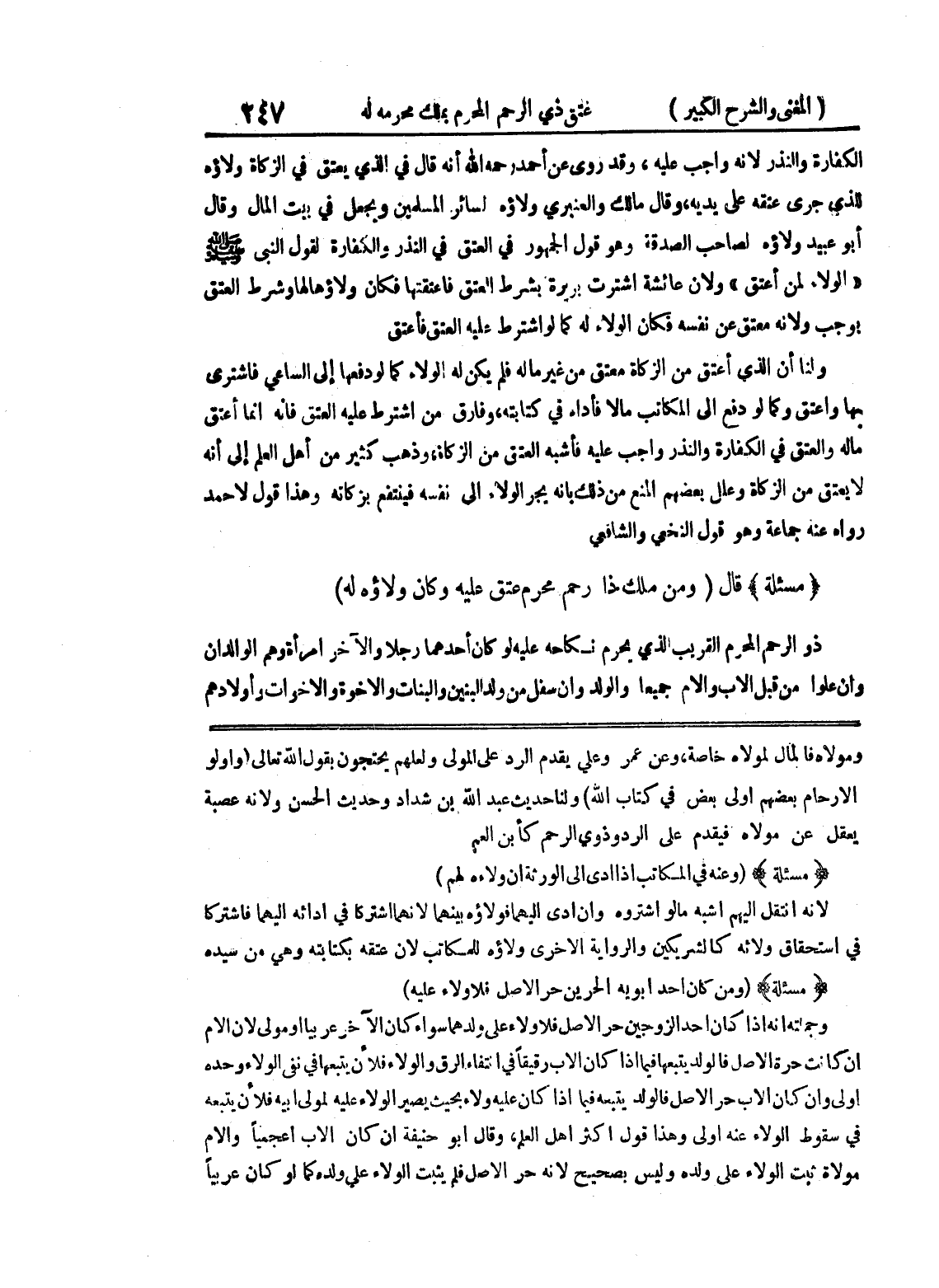 ومولاه فالمال لمولاه خاصة، وعن عمر وعلي يقدم الرد على المولى ولعلهم يحتجون بقول الله تعالى (واولوا الأرحام بعضهم أولى بعض في كتاب الله) ولنا حديث عبد الله بن شداد وحديث الحسن ولأنه عصبة يعقل عن مولاه فيقدم على الرد وذوي الرحم كابن العم (مسألة) (وعنه في المكاتب إذا أدى إلى الورثة أن ولاءه لهم) لأنه انتقل إليهم أشبه ما لو اشتروه وإن أدى إليهما فولاؤه بينهما لأنهما اشتركا في أدائه إليهما فاشتركا في استحقاق ولائه كالشريكين والرواية الأخرى ولاؤه للمكاتب لأن عتقه بكتابته وهي من سيده (مسألة) (ومن كان أحد أبويه الحرين حر الأصل فلا ولاء عليه) وجملته أنه إذا كان أحد الزوجين حر الأصل فلا ولاء على ولدهما سواء كان الآخر عربياً أو مولى لأن الأم إن كانت حرة الأصل فالولد يتبعها فيما إذا كان الأب رقيقاً في انتفاء الرق والولاء فلأن يتبعها في نفي الولاء وحده أولى وإن كان الأب حر الأصل فالولد يتبعه فيما إذا كان عليه ولاء بحيث يصير الولاء عليه لمولى أبيه فلأن يتبعه في سقوط الولاء عنه أولى وهذا قول أكثر أهل العلم، وقال أبو حنيفة إن كان الأب أعجمياً والأم مولاة ثبت الولاء على ولده وليس بصحيح لأنه حر الأصل فلم يثبت الولاء على ولده كما لو كان عربياً