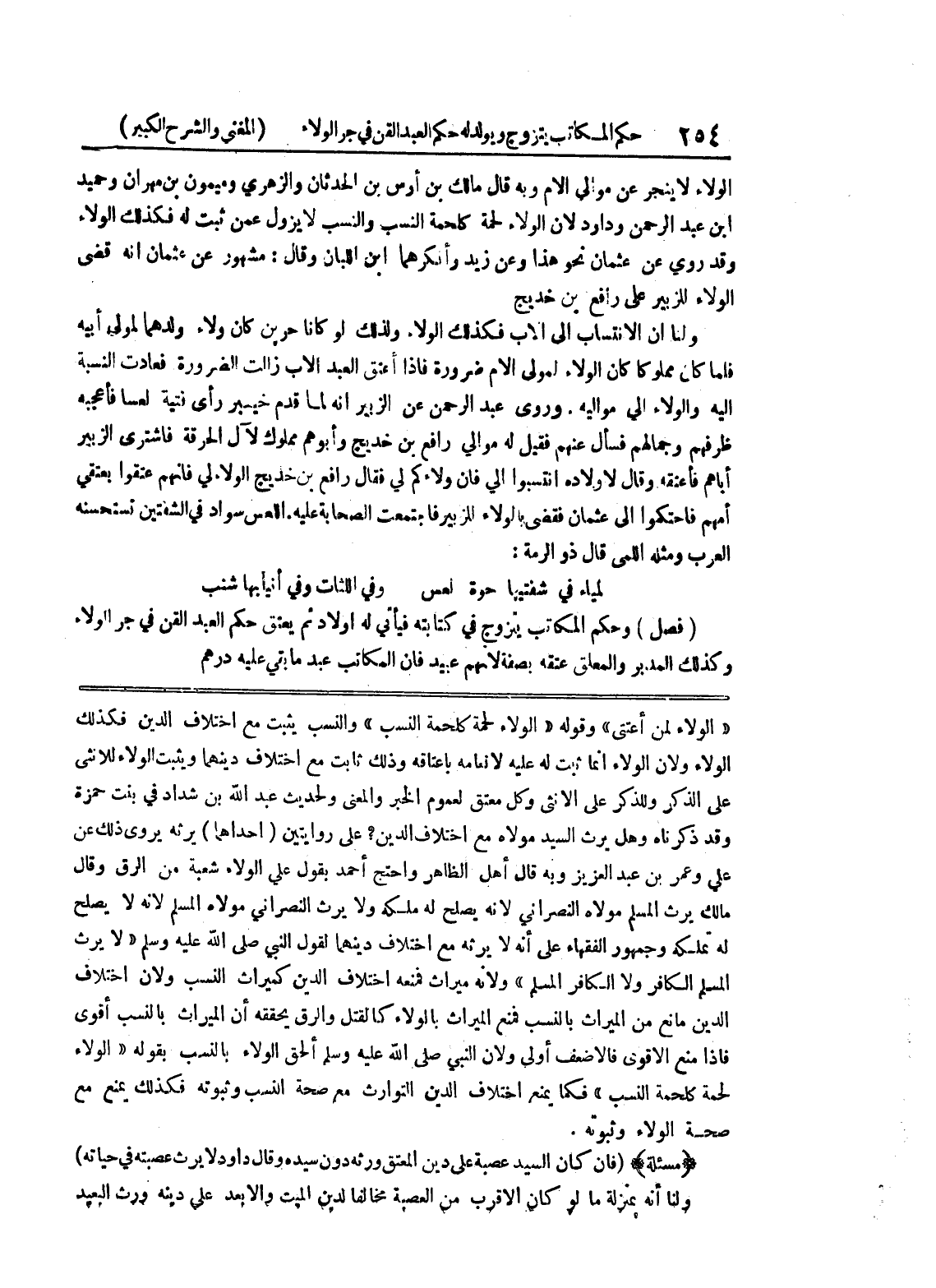 على الذكر وللذكر على الأنثى وكل معتق لعموم الخبر والمعنى ولحديث عبد الله بن شداد في بنت حمزة وقد ذكرناه وهل يرث السيد مولاه مع اختلاف الدين؟ على روايتين (إحداهما) يرثه يروي ذلك عن علي وعمر بن عبد العزيز وبه قال أهل الظاهر واحتج أحمد بقول علي الولاء شعبة من الرق وقال مالك يرث المسلم مولاه النصراني لأنه يصلح له ملكه ولا يرث النصراني مولاه المسلم لأنه لا يصلح له تملكه وجمهور الفقهاء على أنه لا يرثه مع اختلاف دينهما لقول النبي صلى الله عليه وسلم " لا يرث المسلم الكافر ولا الكافر المسلم " ولأنه ميراث فمنعه اختلاف الدين كميراث النسب ولأن اختلاف الدين مانع من الميراث بالنسب فمنع الميراث بالولاء كالقتل والرق يحققه أن الميراث بالنسب أقوى فإذا منع الأقوى فالأضعف أولى ولأن النبي صلى الله عليه وسلم ألحق الولاء بالنسب بقوله " الولاء لحمة كلحمة النسب " فكما يمنع اختلاف الدين التوارث مع صحة النسب وثبوته فكذلك يمنع مع صحة الولاء وثبوته.