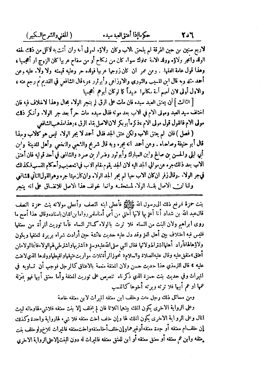 بنت حمزة فرفع ذلك إلى رسول الله صلى الله عليه وسلم فأعطى ابنه النصف وأعطى مولاته بنت حمزة النصف قال عبد الله بن شداد أنا أعلم بها لأنها أختي من أمي أمنا سلمى رواه ابن اللبان بإسناده وقال هذا أصح ما روي إبراهيم ولأن البنت من النساء فلا ترث بالولاء كسائر النساء فأما توريث المرأة من معتقها فليس فيه اختلاف بين أهل العلم وقد دل عليه حديث عائشة حين أرادت شراء بريرة لتعتقها ويكون ولاؤها لها فأراد أهلها اشتراط ولائها فقال النبي صلى الله عليه وسلم " اشتريها واشترطي لهم الولاء فإنما الولاء لمن أعتق " متفق عليه وقال عليه الصلاة والسلام " تحوز المرأة ثلاث مواريث عتيقها ولقيطها وولدها الذي لا عنت عليه " قال الترمذي هذا حديث حسن ولأن المعتقة منعمة بالاعتاق كالرجل فوجب أن تساويه في الميراث وفي حديث بنت حمزة الذي ذكرناه تنصيص على توريث المعتقة وأما معتق أبيها فهو بمنزلة عمها أو عم أبيها فلا ترثه ويرثه أخوها كالنسب ومن مسائل ذلك رجل مات وخلف ابن معتقه الميراث لابن معتقه خاصة وعلى الرواية الأخرى يكون الملك بينهما أثلاثا فإن لم يخلف إلا بنت معتقه فلا شئ لها وماله لبيت المال وعلى الرواية الأخرى يكون الملك لها وإن خلف أخت معتقه فلا شئ لها رواية واحدة وكذلك إن خلف أم معتقه أو جدة معتقه أو غيرهما وإن خلف أخا معتقه وأخت معتقه فالميراث للأخ ولو خلف بنت معتقه وابن عم معتقه أو معتق معتقه أو ابن المعتق معتقه فالميراث له دون البنت إلا على الرواية الأخرى