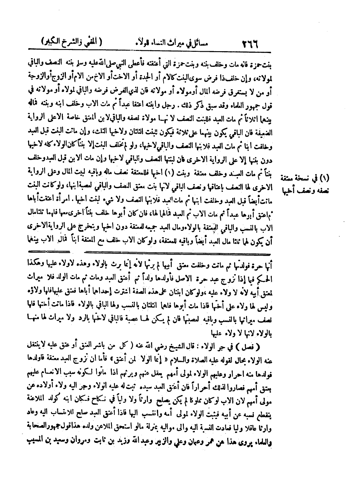 أنها حرة فولدتها ثم ماتت وخلفت معتق أبيها لم يرثها لأنه إنما يرث بالولاء وهذه لا ولاء عليها وهكذا الحكم فيما إذا تزوج عبد حرة الأصل فأولدها ولداً ثم أعتق العبد ومات ثم مات الولد فلا ميراث لمعتق أبيه لأنه لا ولاء عليه، ولو كان ابنتان على هذه الصفة اشترت إحداهما أباها فعتق عليها فلها ولاؤه وليس لها ولاء على أختها فإذا مات أبوها فلهما الثلثان بالنسب ولها الباقي بالولاء فإذا ماتت أختها فلها نصف ميراثها بالنسب وباقيه لعصبتها فإن لم يكن لها عصبة فالباقي لأختها بالرد ولا ميراث لها منها بالولاء لأنها لا ولاء عليها (فصل) في جر الولاء: قال الشيخ رضي الله عنه (كل من باشر العتق أو عتق عليه لا ينتقل عنه الولاء بحال لقوله عليه الصلاة والسلام " إنما الولاء لمن أعتق " فأما ان تزوج العبد معتقة فأولدها فولدها منه أحرار وعليهم الولاء لمولى أمهم يعقل عنهم ويرثهم إذا ماتوا لكونه سبب الإنعام عليهم بعتق أمهم فصاروا لذلك أحراراً فإن أعتق العبد سيده ثبت له عليه الولاء وجر إليه ولاء أولاده عن مولى أمهم لأن الأب لو كان مملوكاً لم يكن يصلح وارثاً ولا ولياً في نكاح فكان ابنه كولد الملاعنة ينقطع نسبه عن أبيه فيثبت الولاء لمولى أمه وانتسب إليها فإذا أعتق العبد صلح للانتساب إليه وعاد وارثاً عاقلاً ولياً فعادت النسبة إليه وإلى مواليه بمنزلة ما لو استحق الملاعن ولده هذا قول جمهور الصحابة والعلماء يروى هذا عن عمر وعثمان وعلي والزبير وعبد الله وزيدبن ثابت ومروان وسعيد بن المسيب