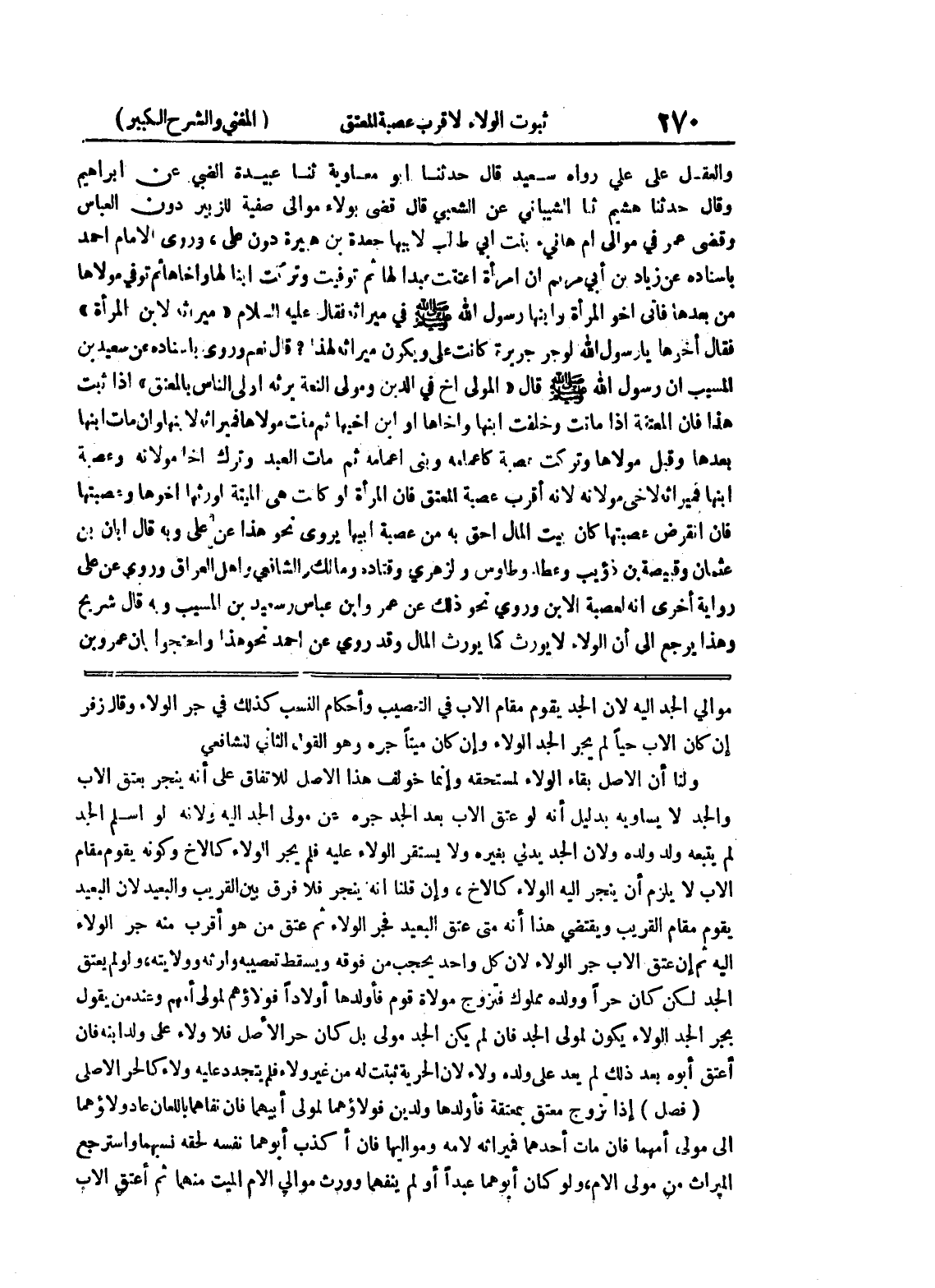 يقوم مقام القريب ويقتضي هذا أنه متى عتق البعيد فجر الولاء ثم عتق من هو أقرب منه جر الولاء اليه ثم إن عتق الأب جر الولاء لأن كل واحد يحجب من فوقه ويسقط تعصيبه وإرثه وولايته، ولو لم يعتق الجد لكن كان حراً وولده مملوك فتزوج مولاة قوم فاولدها أولاداً فولاؤهم لمولى أمهم وعند من يقول بجر الجد الولاء يكون لمولى الجد فإن لم يكن الجد مولى بل كان حرا الأصل فلا ولاء على ولد ابنه فإن أعتق أبوه بعد ذلك لم يعد على ولده ولاء لأن الحرية ثبتت له من غير ولاء فلم يتجدد عليه ولاء كالحر الأصلي (فصل) إذا تزوج معتق بمعتقة فأولدها ولدين فولاؤهما لمولى أبيهما فإن نفاهما باللعان عاد ولاؤهما إلى مولى أمهما فإن مات أحدهما فميراثه لأمه ومواليها فإن أكذب أبوهما نفسه لحقه نسبهما واسترجع الميراث من مولى الأم، ولو كان أبوهما عبداً أو لم ينفهما وورث موالي الأم الميت منهما ثم أعتق الأب