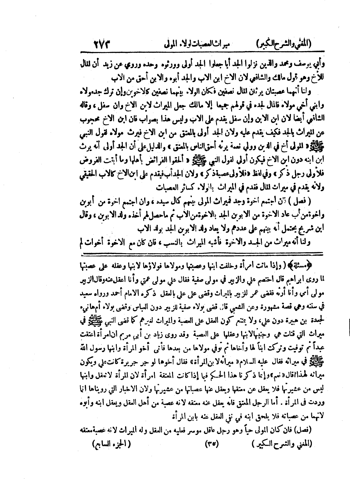(مسألة) (وإذا ماتت امرأة وخلفت ابنها وعصبتها ومولاها فولاؤها لابنها وعقله على عصبتها لما روى إبراهيم قال اختصم علي والزبير في مولى صفية فقال علي مولى عمتي وأنا اعتقل عنه وقال الزبير مولى أمي وأنا أرثه فقضى عمر للزبير بالميراث وقضى على علي بالعقل ذكره الإمام أحمد ورواه سعيد في سننه وهي قصة مشهورة وعن الشعبي قال قضى بولاء صفية للزبير دون العباس وقضى بولاء أم هانئ