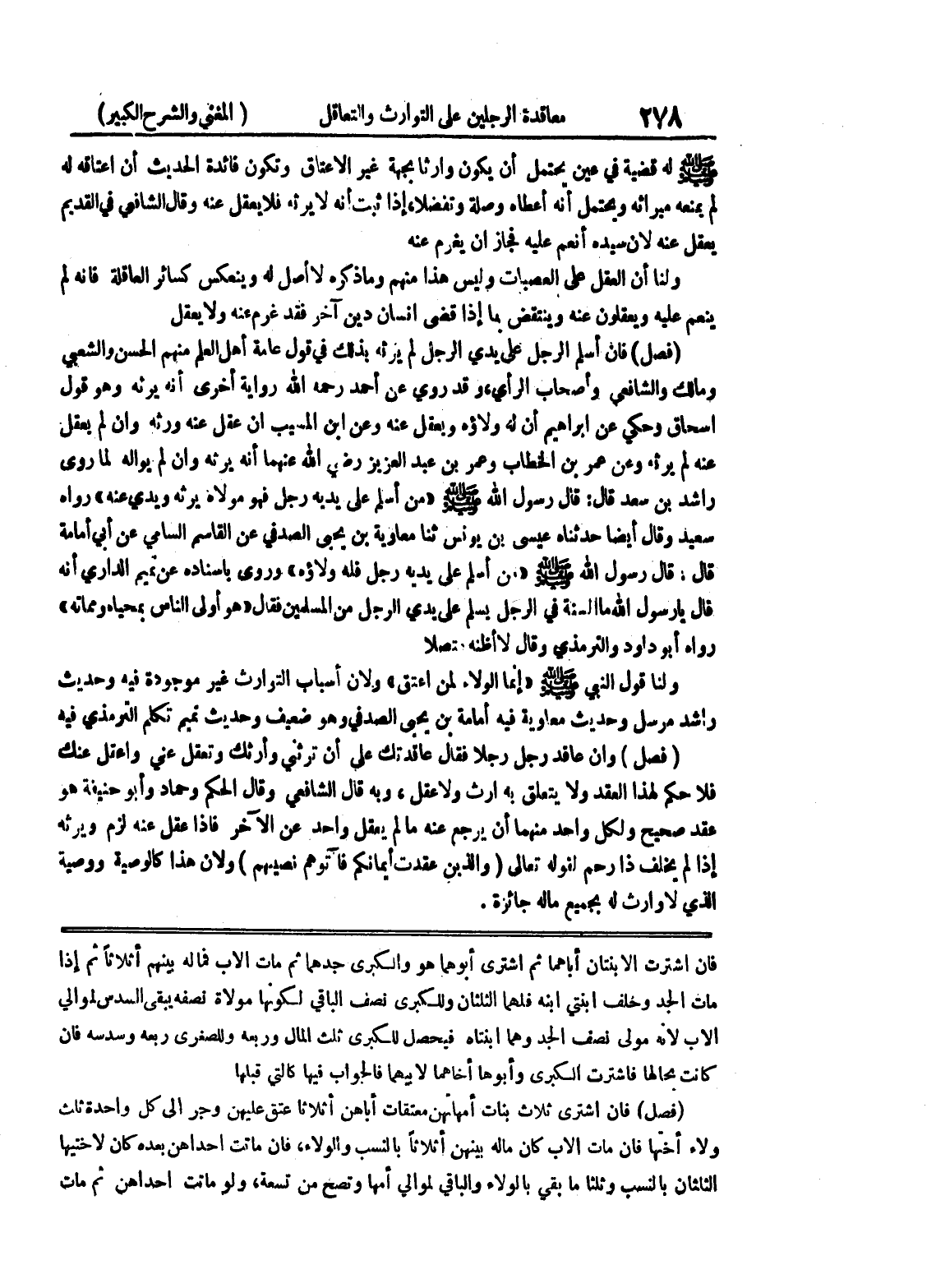 فإن اشترت الابنتان أباهما ثم اشترى أبوهما هو والكبرى جدهما ثم مات الأب فماله بينهم أثلاثاً ثم إذا مات الجد وخلف ابنتي ابنه فلهما الثلثان وللكبرى نصف الباقي لكونها مولاة نصفه يبقى السدس لموالي الأب لأنه مولى نصف الجد وهما ابنتاه فيحصل للكبرى ثلث المال وربعه وللصغرى ربعه وسدسه فإن كانت بحالها فاشترت الكبرى وأبوها أخاهما لأبيهما فالجواب فيها كالتي قبلها (فصل) فإن اشترى ثلاث بنات أمهاتهن معتقات أباهن أثلاثا عتق عليهن وجر إلى كل واحدة ثلث ولاء أختها فإن مات الأب كان ماله بينهن أثلاثاً بالنسب والولاء، فإن ماتت إحداهن بعده كان لأختيها الثلثان بالنسب وثلثا ما بقي بالولاء والباقي لموالي أمها وتصح من تسعة، ولو ماتت إحداهن ثم مات