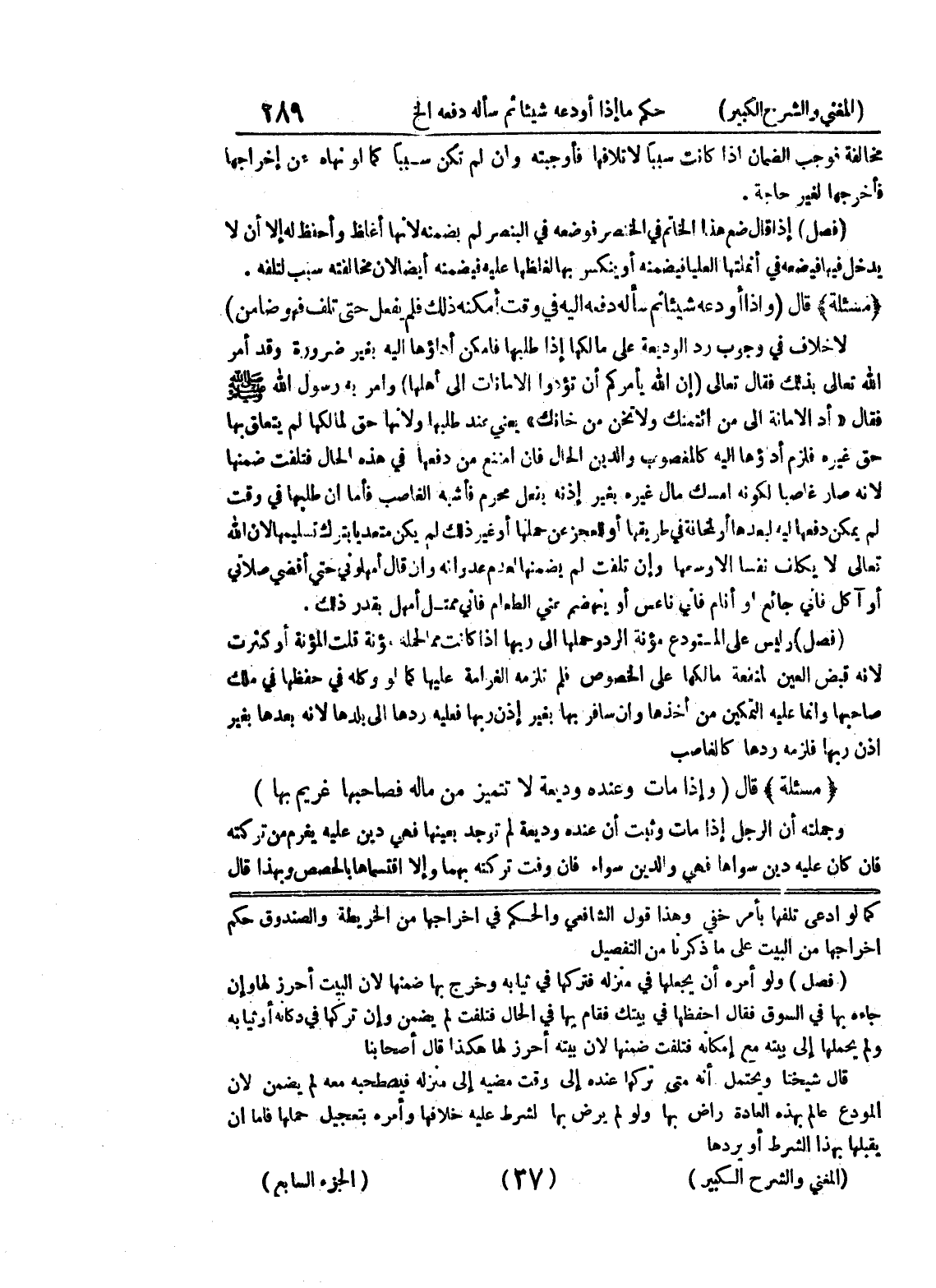 كما لو ادعى تلفها بأمر خفي وهذا قول الشافعي والحكم في إخراجها من الخريطة والصندوق حكم اخراجها من البيت على ما ذكرنا من التفصيل (فصل) ولو أمره أن يجعلها في منزله فتركها في ثيابه وخرج بها ضمها لأن البيت أحرز لها وإن جاءه بها في السوق فقال احفظها في بيتك فقام بها في الحال فتلفت لم يضمن وإن تركها في دكانه أو ثيابه ولم يحملها إلى بيته مع إمكانه فتلفت ضمنها لأن بيته أحرز لها هكذا قال أصحابنا قال شيخنا ويحتمل أنه متى تركها عنده إلى وقت مضيه إلى منزله فيصطحبه معه لم يضمن لأن المودع عالم بهذه العادة راض بها ولو لم يرض بها لشرط عليه خلافها وأمره بتعجيل حملها فأما إن يقبلها بهذا الشرط أو يردها