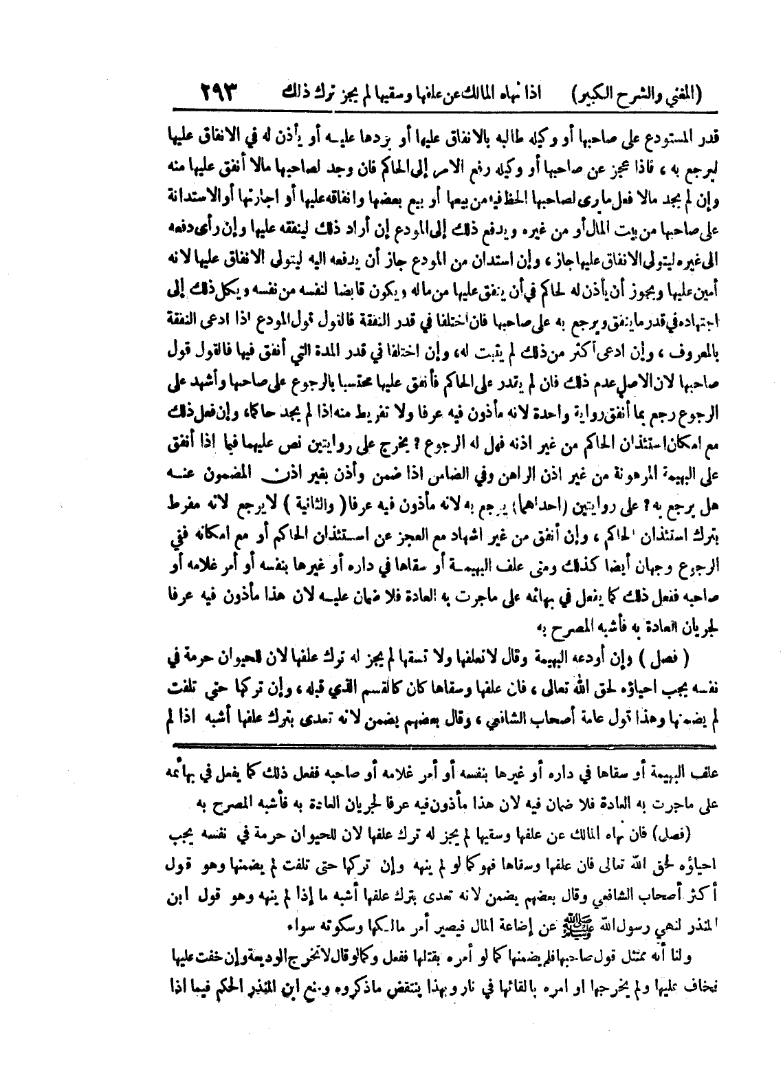 علف البهيمة أو سقاها في داره أو غيرها بنفسه أو أمر غلامه أو صاحبه ففعل ذلك كما يفعل في بهائمه على ما جرت به العادة فلا ضمان فيه لأن هذا مأذون فيه عرفاً لجريان العادة به فأشبه المصرح به (فصل) فإن نهاه المالك عن علفها وسقيها لم يجز له ترك علفها لأن للحيوان حرمة في نفسه يجب إحياؤه لحق الله تعالى فإن علفها وسقاها فهو كما لو لم ينهه وإن تركها حتى تلفت لم يضمنها وهو قول أكثر أصحاب الشافعي وقال بعضهم يضمن لأنه تعدى بترك علفها أشبه ما إذا لم ينهه وهو قول ابن المنذر لنهي رسول الله صلى الله عليه وسلم عن إضاعة المال فيصير أمر مالكها وسكوته سواء