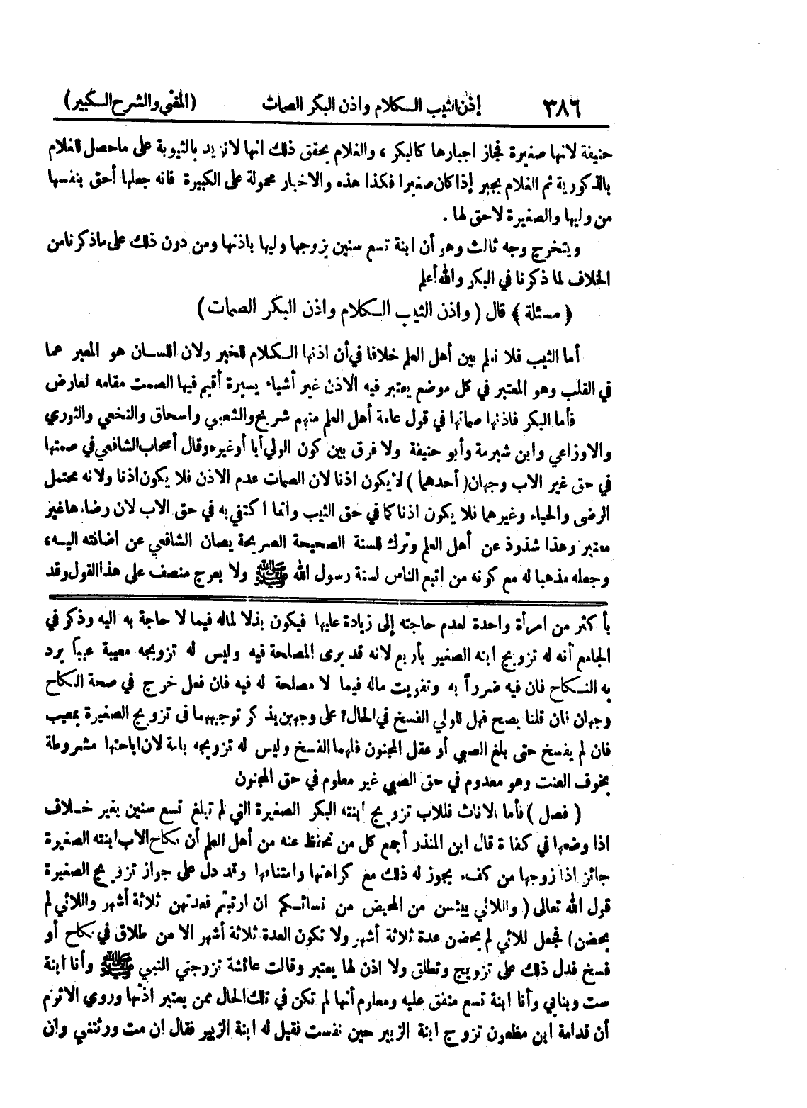 بأكثر من امرأة واحدة لعدم حاجته إلى زيادة عليها فيكون بذلا لماله فيما لا حاجة به إليه وذكر في الجامع أنه له تزويج ابنه الصغير بأربع لأنه قد يرى المصلحة فيه وليس له تزويجه معيبة عيباً يرد به النكاح فإن فيه ضرراً به وتفويت ماله فيما لا مصلحة له فيه فإن فعل خرج في صحة النكاح وجهان فإن قلنا يصح فهل للولي الفسخ في الحال؟ على وجهين يذكر توجيههما في تزويج الصغيرة بمعيب فإن لم يفسخ حتى بلغ الصبي أو عقل المجنون فلهما الفسخ وليس له تزويجه بأمة لأن إباحتها مشروطة بخوف العنت وهو معدوم في حق الصبي غير معلوم في حق المجنون (فصل) فأما الإناث فللأب تزويج ابنته البكر الصغيرة التي لم تبلغ تسع سنين بغير خلاف إذا وضعها في كفاءة قال إبن المنذر أجمع كل من نحفظ عنه من أهل العلم أن نكاح الأب ابنته الصغيرة جائز إذا زوجها من كفء يجوز له ذلك مع كراهتها وامتناعاه وقد دل على جواز تزويج الصغيرة قول الله تعالى (واللائي ييئسن من المحيض من نسائكم إن ارتبتم فعدتهن ثلاثة أشهر واللائي لم يحضن) فجعل للائي لم يحضن عدة ثلاثة أشهر ولا تكون العدة ثلاثة أشهر إلا من طلاق في نكاح أو فسخ فدل ذلك على تزويج وتطلق ولا إذن لها يعتبر وقالت عائشة تزوجني النبي صلى الله عليه وسلم وأنا ابنة ست وبنابي وأنا ابنة تسع متفق عليه ومعلوم أنها لم تكن في تلك الحال ممن يعتبر إذنها وروى الأثرم