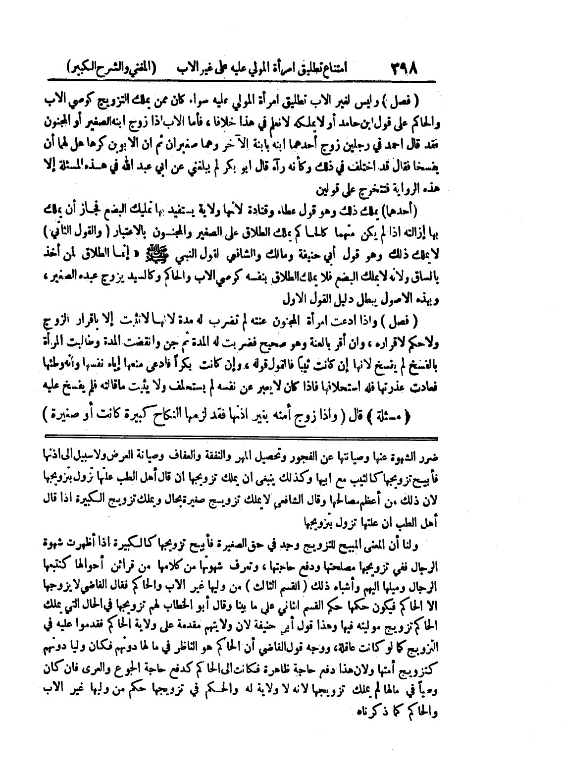 ضرر الشهوة عنها وصيانتها عن الفجور وتحصيل المهر والنفقة والعفاف وصيانة العرض ولا سبيل إلى إذنها فأبيح تزويجها كالثيب مع أبيها وكذلك يبنغي أن يملك تزويجها إن قال أهل الطب علتها تزول بتزويجها لأن ذلك من أعظم مصالحها وقال الشافعي لا يملك تزويج صغيرة بحال ويملك تزويج الكبيرة إذا قال أهل الطب أن علتها تزول بتزويجها ولنا أن المعنى المبيح للتزويج وجد في حق الصغيرة فأبيح تزويجها كالكبيرة إذا أظهرت شهوة الرجال ففي تزويجها مصلحتها ودفع حاجتها، وتعرف شهوتها من كلامها من قرائن أحوالها كتتبعها الرجال وميلها إليهم وأشباه ذلك (القسم الثالث) من وليها غير الأب والحاكم فقال القاضي لا يزوجها إلا الحاكم فيكون حكمها حكم القسم الثاني على ما بينا وقال أبو الخطاب لهم تزويجها في الحال التي يملك الحاكم تزويج موليته فيها وهذا قول أبي حنيفة لأن ولايتهم مقدمة على ولاية الحاكم فقدموا عليه في التزويج كما لو كانت عاقلة، ووجه قول القاضي أن الحاكم هو الناظر في مالها دونهم فكان ولياً دونهم كتزويج أمتها ولأن هذا دفع حاجة ظاهرة فكانت إلى الحاكم كدفع حاجة الجوع والعري فإن كان وصياً في مالها لم يملك تزويجها لأنه لا ولاية له والحكم في تزويجها حكم من وليها غير الأب