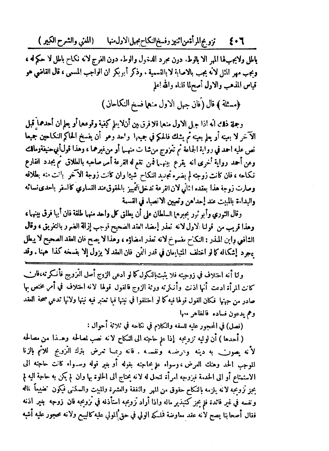 ولنا أنه اختلاف في زوجيته فلا يثبت بالنكول كما لو ادعى الزوج أصل التز ويج فأنكرته، فإن كانت المرأة ادعت أنها أذنت وأنكرته ورثة الزوج فالقول قولها لأنه اختلاف في أمر مختص بها صادر من جهتها فكان القول قولها فيه كما لو اختلفوا في نيتها فيما تعتبر فيه نيتها ولأنها تدعي صحة العقد وهم يدعون فساده فالظاهر معها (فصل) في المحجور عليه للسفه والكلام في نكاحه في ثلاثة أحوال: (أحدها) أن لوليه تزويجه إذا علم حاجته إلى النكاح لأنه نصب لمصالحه وهذا من مصالحه