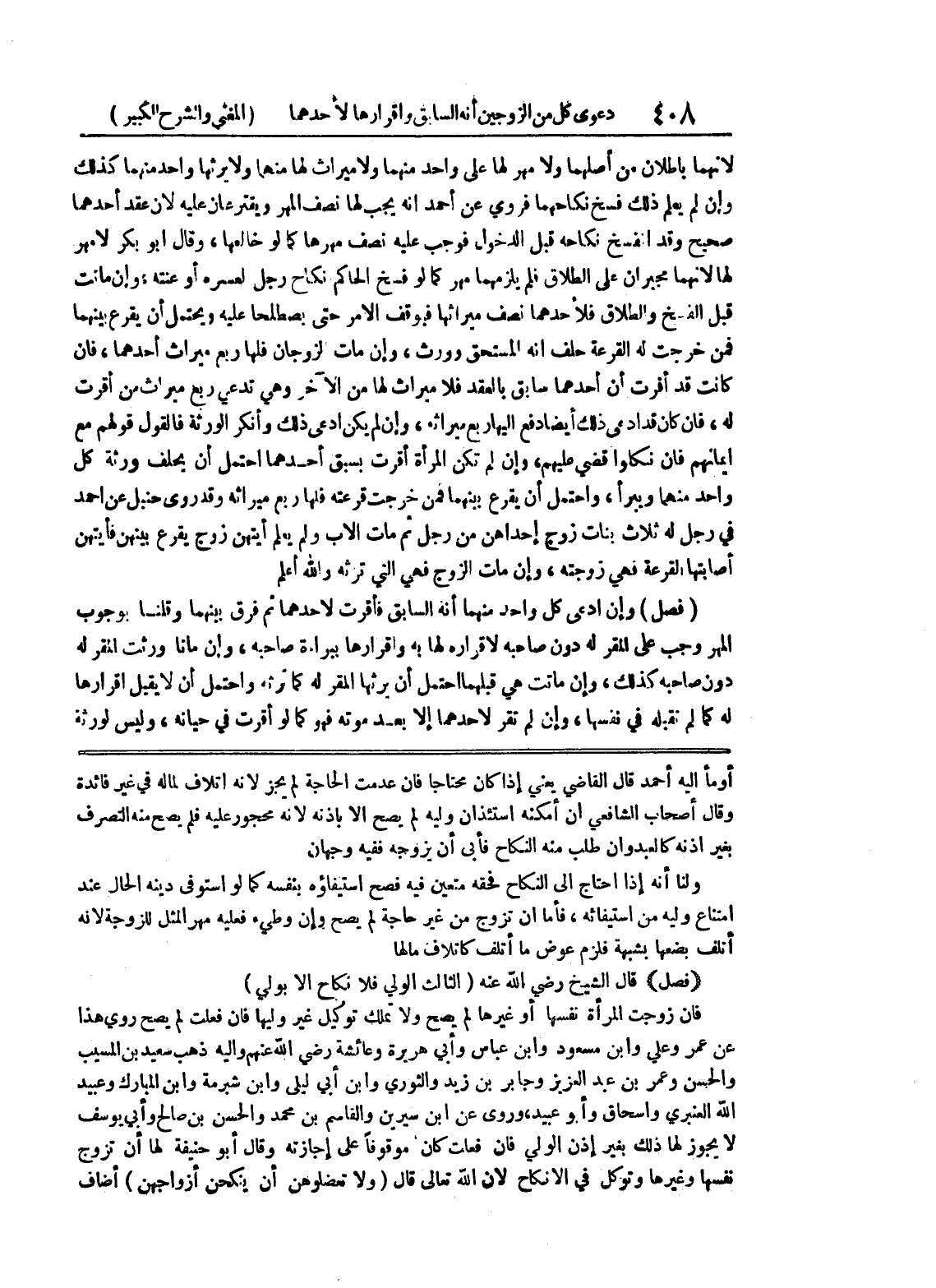 بغير إذنه كالعبد وإن طلب منه النكاح فأبى أن يزوجه ففيه وجهان ولنا أنه إذا احتاج إلى النكاح فحقه متعين فيه فصح استيفاؤه بنفسه كما لو استوفى دينه الحال عند امتناع وليه من استيفائه، فأما ان تزوج من غير حاجة لم يصح وإن وطئ فعليه مهر المثل للزوجة لأنه أتلف بضعها بشبهة فلزم عوض ما أتلف كإتلاف مالها (فصل) قال الشيخ رضي الله عنه (الثالث الولي فلا نكاح إلا بولي) فإن زوجت المرأة نفسها أو غيرها لم يصح ولا تملك توكيل غير وليها فإن فعلت لم يصح روي هذا عن عمر وعلي وابن مسعود وابن عباس وأبي هريرة وعائشة رضي الله عنهم وإليه ذهب سعيد بن المسيب والحسن وعمر بن عبد العزيز وجابر بن زيد الثوري وابن أبي ليلى وابن شبرمة وابن المبارك وعبيد الله العنبري واسحاق وأبو عبيد، وروي عن ابن سيرين والقاسم بن محمد والحسن بن صالح وأبي يوسف لا يجوز لها ذلك بغير إذن الولي فإن فعلت كان موقوفاً على إجازته وقال أبو حنيفة لها أن تزوج نفسها وغيرها وتوكل في الإنكاح لأن الله تعالى قال (ولا تعضلوهن أن ينكحن أزواجهن) أضاف