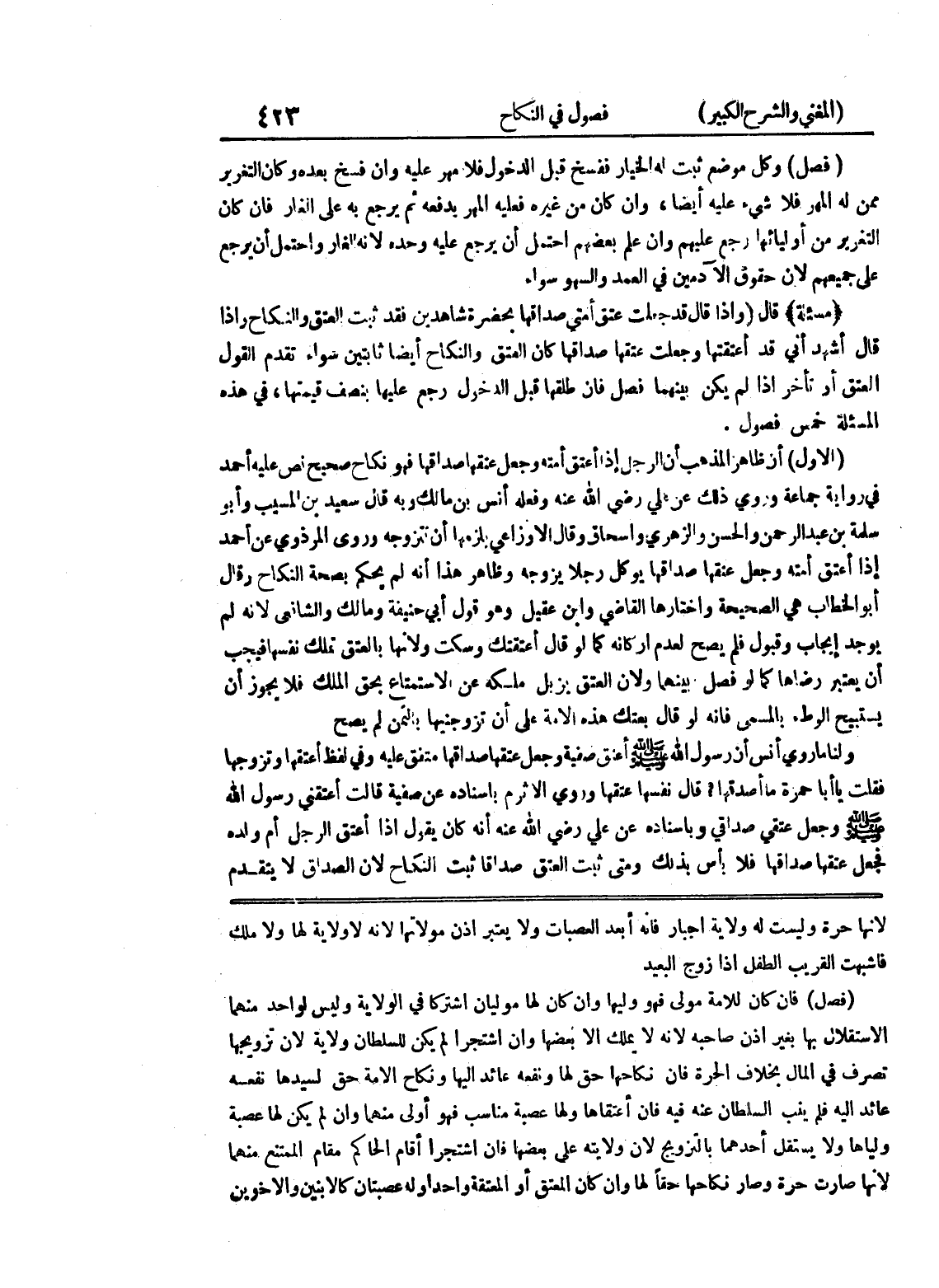 لأنها حرة وليست له ولاية إجبار فإنه أبعد العصبات ولا يعتبر إذن مولاتها لأنه لا ولاية لها ولا ملك فاشبهت القريب الطفل إذا زوج البعيد (فصل) فإن كان للأمة مولى فهو وليها وإن كان لها موليان اشتركا في الولاية وليس الواحد منهما الاستقلال بها بغير إذن صاحبه لأنه لا يملك إلا بعضها وإن اشتجرا لم يكن للسلطان ولاية لأن تزويجها تصرف في المال بخلاف الحرة فإن نكاحها حق لها ونفعه عائد إليها ونكاح الأمة حق لسيدها نفعه عائد إليه فلم ينب السلطان عنه فيه فإن أعتقاها ولها عصبة مناسب فهو أولى منهما وإن لم يكن لها عصبة ولياها ولا يستقل أحدهما بالتزويج لأن ولايته على بعضها فإن اشتجرا أقام الحاكم مقام الممتنع منهما لأنها صارت حرة وصار نكاحها حقاً لها وإن كان المعتق أو المعتقة واحدا وله عصبتان كالابنين والأخوين