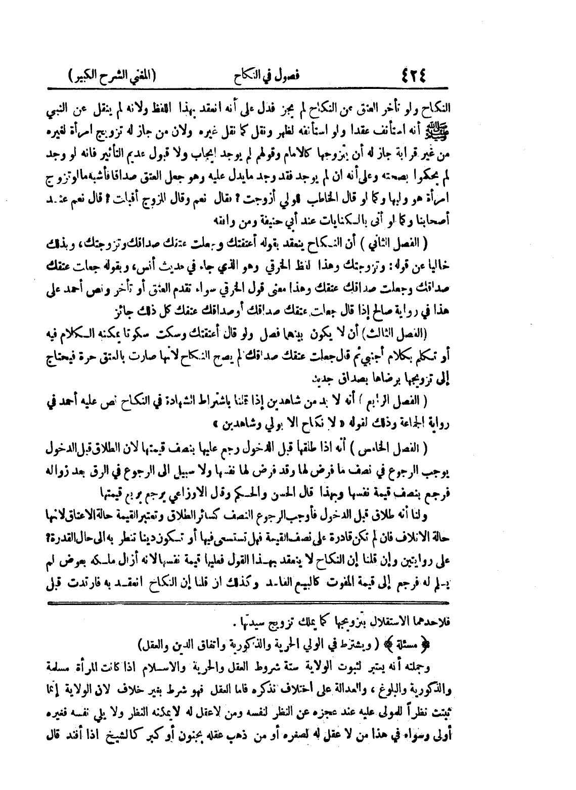 (مسألة) (ويشترط في الولي الحرية والذكورية واتفاق الدين والعقل) وجملته أنه يعتبر لثبوت الولاية ستة شروط العقل والحرية والإسلام إذا كانت المرأة مسلمة والذكورية والبلوغ، والعدالة على اختلاف نذكره فأما العقل فهو شرط بغير خلاف لأن الولاية إنما ثبتت نظراً للمولى عليه عند عجزه عن النظر لنفسه ومن لا عقل له لا يمكنه النظر ولا يلي نفسه فغيره