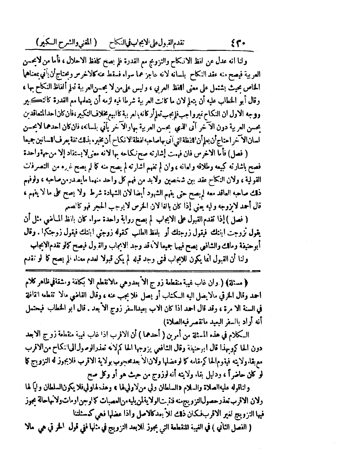 قال أبو الخطاب فيحتمل أنه أراد بالسفر البعيد ما تقصر فيه الصلاة) الكلام في هذه المسألة من أمرين (أحدهما) أن الأقرب إذا غاب غيبة منقطعة زوج الأبعد دون الحاكم وبهذا قال أبو حنيفة وقال الشافعي يزوجها الحاكم لأنه تعذر الوصول إلى النكاح من الأقرب مع بقاء ولايته فيقوم الحاكم مقامه كما لو عضلها ولأن الأبعد محجوب بولاية الأقرب فلا يجوز له التزويج كما لو كان حاضراً، ودليل بقاء ولايته أنه لو زوج من حديث هو أو كل صح ولنا قوله عليه الصلاة والسلام " السلطان ولي من لاولي لها " وهذه لها ولي فلا يكون السلطان ولياً لها ولأن الأقرب تعذر حصول التزويج منه فتثبت الولاية لم يليه من العصبات كما لو جن أو مات ولأنها حالة يجوز فيها التزويج لغير الأقرب فكان ذلك للأبعد كالاصل وإذا عظلها فهي كمسئلتنا (الفصل الثاني) في الغيبة المنقطعة التي يجوز للأبعد التزويج في مثلها ففي قول الخرقي هي مالا