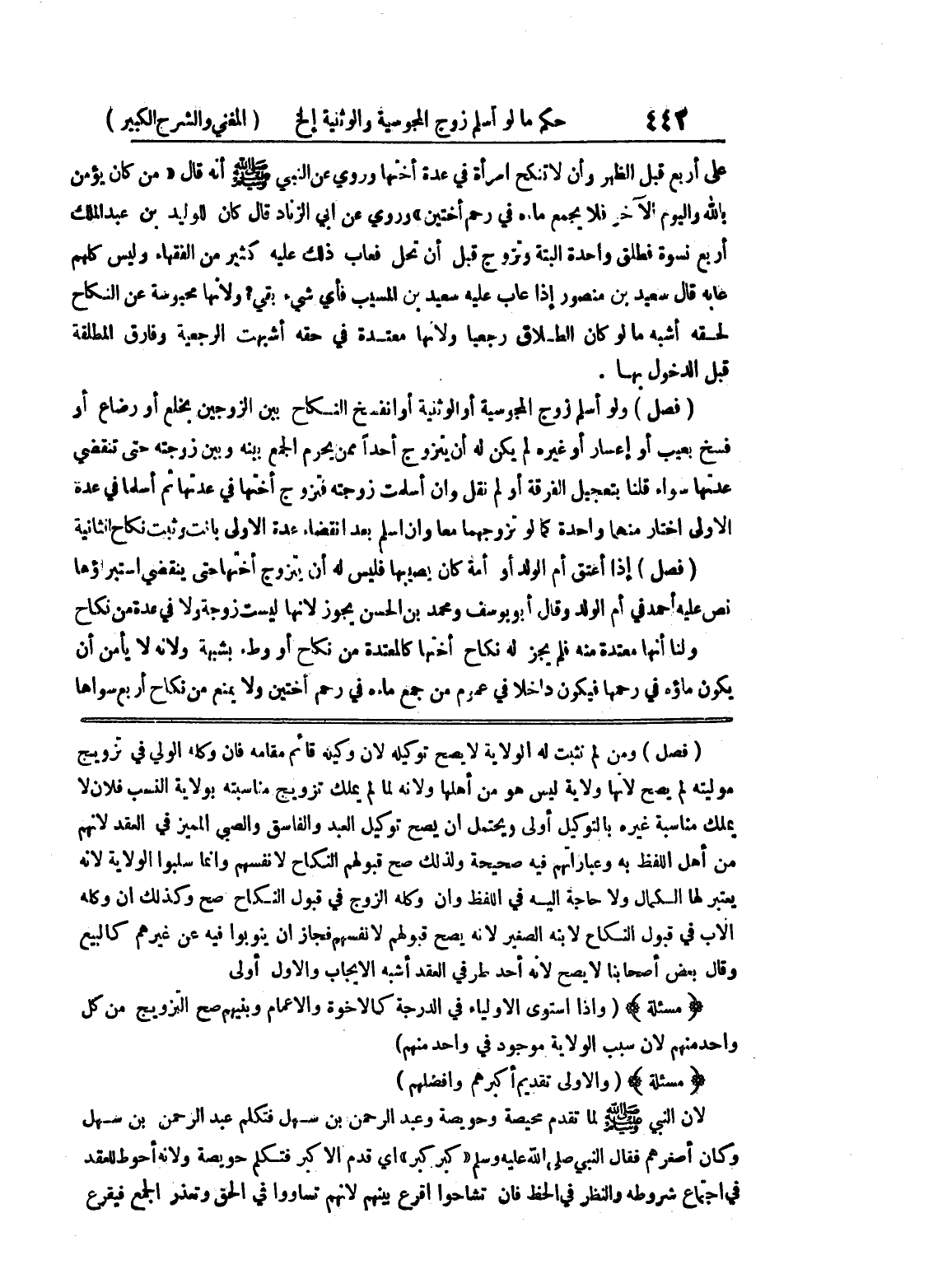 (فصل) ومن لم نثبت له الولاية لا يصح توكيله لأن وكيله قائم مقامه فإن وكله الولي في تزويج موليته لم يصح لأنها ولاية ليس هو من أهلها ولأنه لما لم يملك تزويج مناسبة بولاية النسب فلأن لا يملك مناسبة غيره بالتوكيل أولى ويحتمل أن يصح توكيل العبد والفاسق والصبي المميز في العقد لأنهم من أهل اللفظ به وعباراتهم فيه صحيحة ولذلك صح قبولهم النكاح لأنفسهم وإنما سلبوا الولاية لأنه يعتبر لها الكمال ولا حاجة إليه في اللفظ وإن وكله الزوج في قبول النكاح صح وكذلك انه وكله الأب في قبول النكاح لابنه الصغير لأنه يصح قبولهم لأنفسهم فجاز أن ينوبوا فيه عن غيرهم كالبيع وقال بعض أصحابنا لا يصح لأنه أحد طرفي العقد أشبه الإيجاب والأول أولى (مسألة) (وإذا استوى الأولياء في الدرجة كالإخوة والأعمام وبنيهم صح التزويج من كل واحد منهم لأن سبب الولاية موجود في واحد منهم) (مسألة) (والأولى تقديم أكبرهم وافضلهم) لأن النبي صلى الله عليه وسلم لما تقدم محيصة وحويصة وعبد الرحمن بن سهل فتكم عبد الرحمن بن سهل وكان أصغرهم فقال النبي صلى الله عليه وسلم (كبر كبر) أي قدم الاكبر فتكم حويصة ولأنه أحوط للعقد في اجتماع شروطه والنظر في الحظ فإن تشاحوا أقرع بينهم لأنهم تساووا في الحق وتعذر الجمع فيقرع