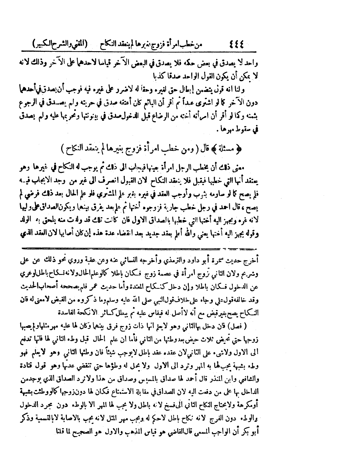 أخرج حديث سمرة أبو داود والترمذي وأخرجه النسائي عنه وعن عقبة وروي نحو ذلك عن علي وشريح ولأن الثاني تزوج امرأة في عصمة زوج فكان باطلاً كما لو علم الحال ولأنه نكاح باطل لو عري عن الدخول فكان باطلا وإن دخل كنكاح المعتدة وأما حديث عمر فلم يصححه أصحاب الحديث وقد خالفه قول علي وجاء على خلاف قول النبي صلى الله عليه وسلم وما ذكروه من القبض لا معنى له فإن النكاح يصح بغير قبض مع أنه لا أصل له فيقاس عليه ثم يبطل كسائر الانكحة الفاسدة (فصل) فإن دخل بها الثاني وهو يعلم أنها ذات زوج فرق بينهما وكان لها عليه مهر مثلها ولم يصبها زوجها حتى تحيض ثلاث حيض بعد وطئها من الثاني فأما إن علم الحال قبل وطئ الثاني لها فانها تدفع إلى الأول ولا شئ عليا لثاني لأن عقده عقد باطل لا يوجب شيئاً فإن وطئها الثاني وهو لا يعلم فهو