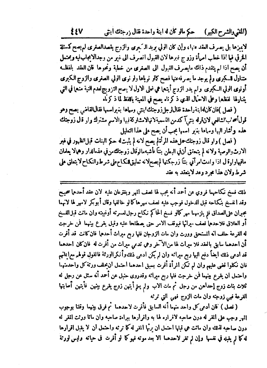 ذلك فسخ نكاحهما فروي عن أحمد أنه يجب لها نصف المهر ويقترعان عليه لأن عقد أحدهما صحيح وقد انفسخ بنكاحه قبل الدخول فوجب عليه نصف مهرها كما لو خالفها وقال أبو بكر لا مهر لها لأنهما مجبران على الصداق فلم يزلمهما مهر كما لو فسخ الحاكم نكاح رجل لعسرته أو غيبته وإن ماتت قبل الفسخ أو الطلاق فلأحدهما نصف ميراثها فيوقف الأمر حتى يصطلحا عليه وقيل يقر بينهما فمن خرجت له القرعة حلف أنه المستحق وورث وإن مات الزوجان فلها ربع ميراث أحدهما فإن كانت قد أقرت أن أحدهما سابق بالعقد فلا ميراث لها من الآخر وهي تدعي ميراث من أقرت له فإن كان أحدهما قد ادعى ذلك أيضاً دفع إليها ربع ميراثه وإن لم يكن ادعى ذلك وأنكر الورثة فالقول قولهم مع إيمانهم