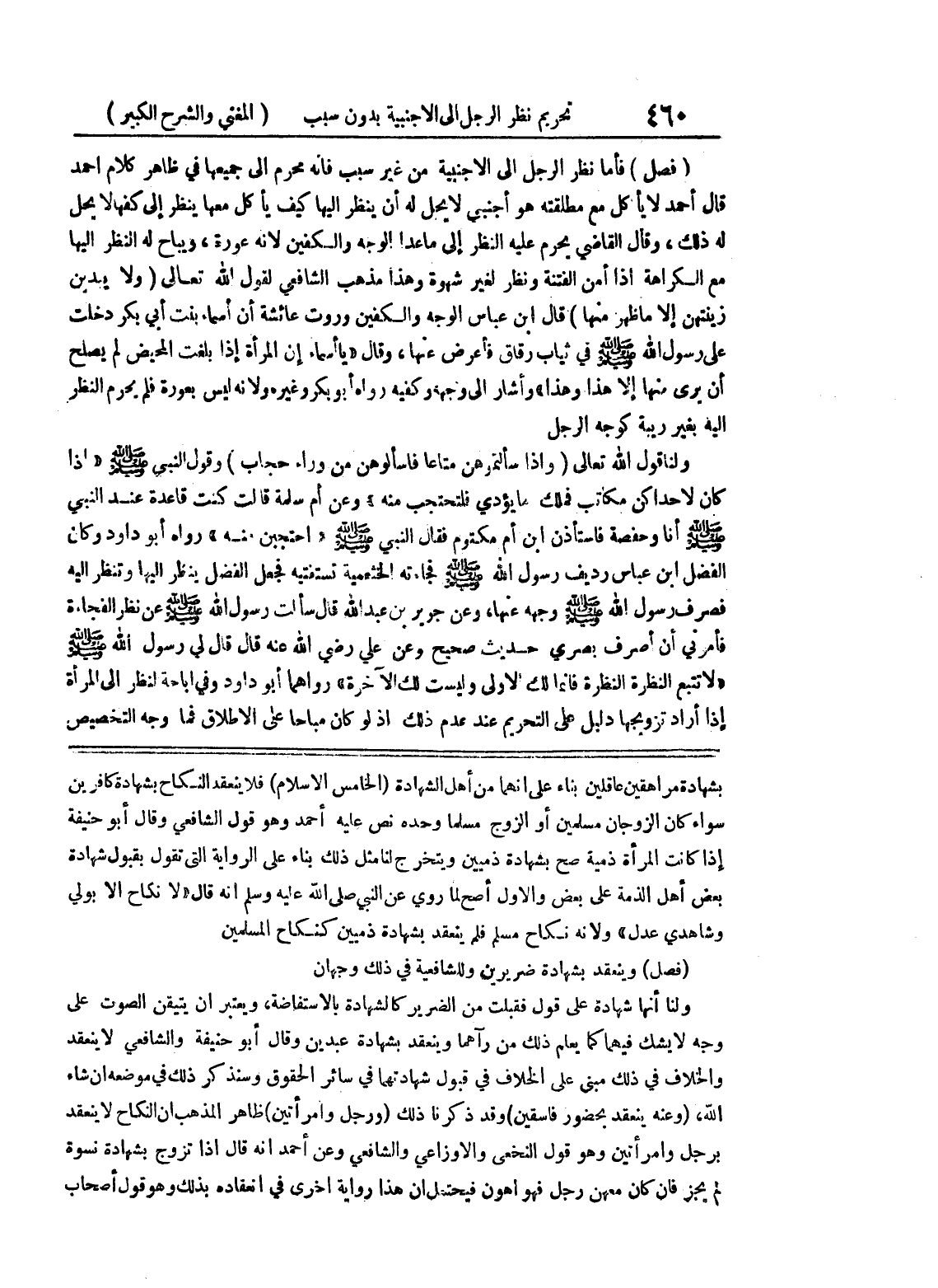 بشهادة مراهقين عاقلين بناء على أنهما من أهل الشهادة (الخامس الإسلام) فلا ينعقد النكاح بشهادة كافرين سواء كان الزوجان مسلمين أن الزوج مسلماً وحده نص عليه أحمد وهو قول الشافعي وقال أبو حنيفة إذا كانت المرأة ذمية صح بشهادة ذميين ويتخرج لنا مثل ذلك بناء على الرواية التي تقول بقبول شهادة بعض أهل الذمة على بعض والأول أصح لما روي عن النبي صلى الله عليه وسلم أنه قال (لا نكاح إلا بولي وشاهدي عدل) ولأنه نكاح مسلم فلم ينعقد بشهادة ذميين كنكاح المسلمين (فصل) وينعقد بشهادة ضريرين وللشافعية في ذلك وجهان ولنا انها شهادة على قول فقبلت من الضرير كالشهادة بالاستفاضة، ويعتبر أن يتيقن الصوت على وجه لا يشك فيهما كما يعلم ذلك من رآهما وينعقد بشهادة عبدين وقال أبو حنيفة والشافعي لا ينعقد والخلاف في ذلك مبني على الخلاف في قبول شهادتهما في سائر الحقوق وسنذكر ذلك في موضعهه إن شاء الله، (وعنه ينعقد بحضور فاسقين) وقد ذكرنا ذلك (ورجل وامرأتين) ظاهر المذهب أن النكح لا ينعقد برجل وامرأتين وهو قول النخعي والاوزاعي والشافعي وعن أحمد أنه قال إذا تزوج بشهادة نسوة