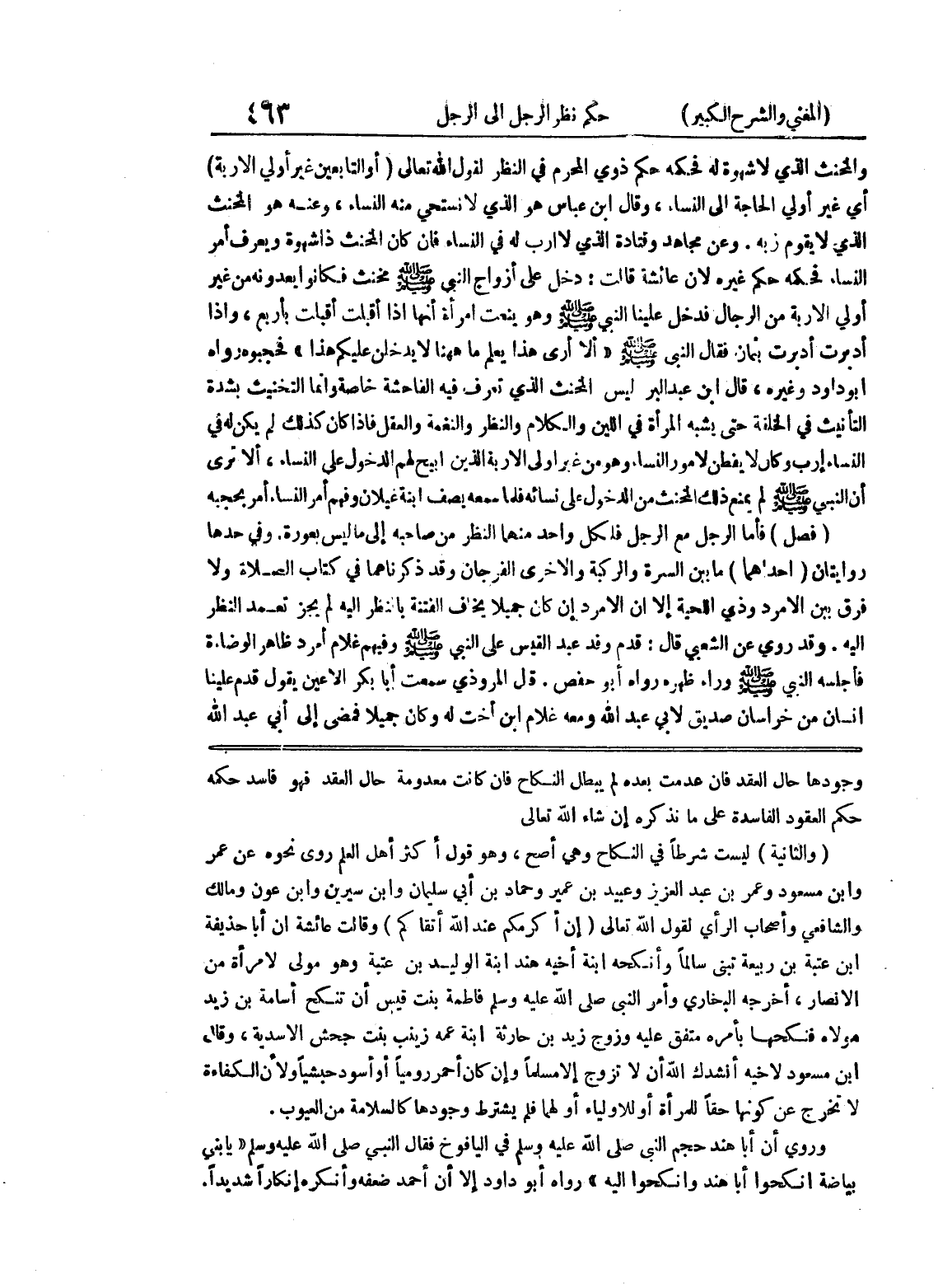 وجودها حال العقد فإن عدمت بعده يبطل النكاح فإن كانت معدومة حال العقد فهو فاسد حكمه حكم العقود الفاسدة على ما نذكره إن شاء الله تعالى (والثانية) ليست شرطاً في النكاح وهي أصح، وهو قول أكثر أهل العلم روي نحوه عن عمر وابن مسعود وعمر بن عبد العزيز وعبيد بن عمير وحماد بن أبي سليمان وابى سبرين وابن عون ومالك والشافعي وأصحاب الرأي لقول الله تعالى (أن أكرمكم عند الله أتقاكم) وقالت عائشة أن أبا حذيفة ابن عتبة بن ربيعة تبنى سالماً وأنكحه ابنة أخيه هند ابنة الوليد بن عتبة وهو مولى لامرأة من الأنصار، أخرجه البخاري وأمر النبي صلى الله عليه وسلم فاطمة بنت قيس أن تنكح أسامة بن زيد مولاه فنكحها بأمره متفق عليه وزوج زيد بن حارثة ابنة عمه زينب بنت جحش الأسدية، وقال ابن مسعود لأخيه أنشدك الله أن لا تزوج إلا مسلماً وإن كان أحمر رومياً أو أسود حبشياً ولأن الكفاءة لا تخرج عن كونها حقاً للمرأة أو للاولياء أولهما فلم يشترط وجودها كالسلامة من العيوب وروي أن أبا هند حجم النبي صلى الله عليه وسلم في اليافوخ فقال النبي صلى الله عليه وسلم (يا بني بياضة أنكحوا أبا هند وأنكحوا إليه) رواه أبو داود إلا أن أحمد ضعفه وأنكره إنكاراً شديداً.