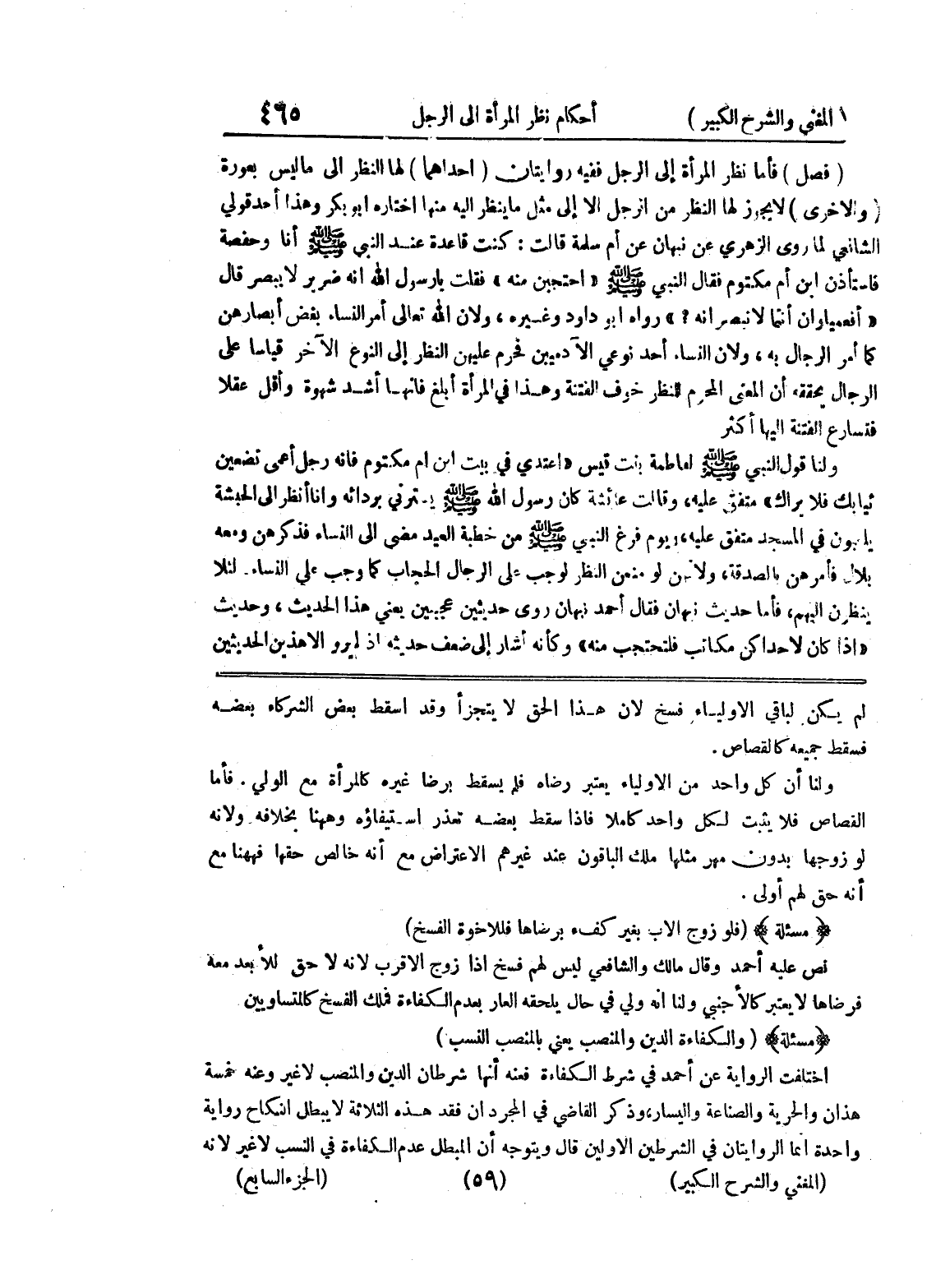(مسألة) (فلو زوج الاب بغير كفء برضاها فللاخوة الفسخ) نص عليه أحمد وقال مالك والشافعي ليس لهم فسخ إذا زوج الأقرب لأنه لا حق للأبعد معه فرضاها لا يعتبر كالأجنبي ولنا أنه ولي في حال يلحقه العار بعدم الكفاءة فملك الفسخ كالمتساويين (مسألة) (والكفاءة الدين والمنصب يعني بالمنصب النسب) اختلف الرواية عن أحمد في شرط الكفاءة فعنه أنها شرطان الدين والمنصب لا غير وعنه خمسة هذان والحرية والصناعة واليسار، وذكر القاضي في المجرد أن فقد هذه الثلاثة لا يبطل النكاح رواية