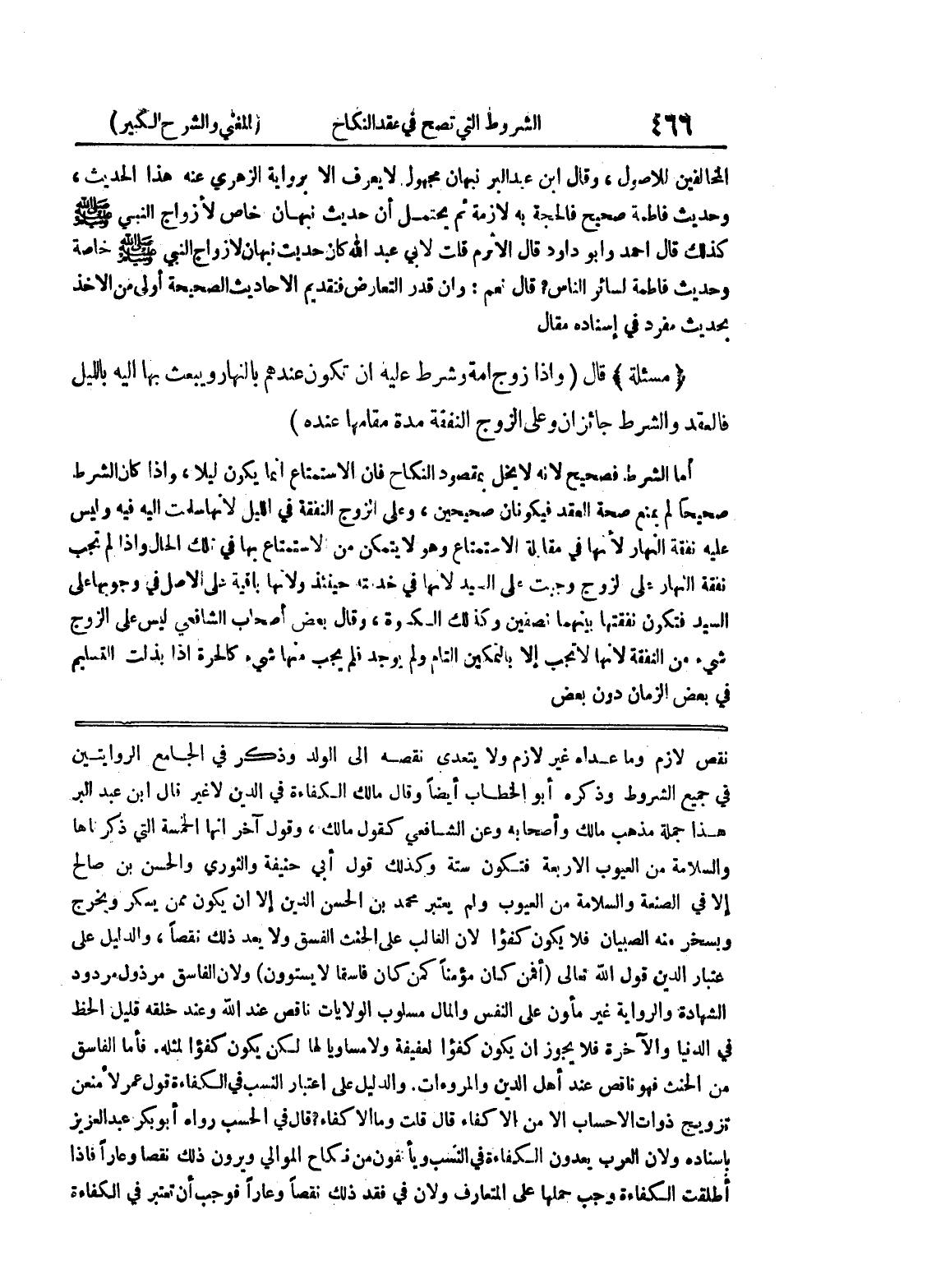 نقص لازم وما عداه غير لازم ولا يتعدى نقصه إلى الولد وذكر في الجامع الروايتين في جميع الشروط وذكره أبو الخطاب أيضا وقال مالك الكفاءة في الدين لا غير قال ابن عبد البر هذا جملة مذهب مالك وأصحابه وعن الشافعي كقول مالك، وقول آخر أنها الخمسة التي ذكرناها والسلامة من العيوب الاربعة فتكون سنة وكذلك قول أبي حنيفة والثوري والحسن بن صالح إلا في الصنعة والسلامة من العيوب ولم يعتبر محمد بن الحسن الدين إلا أن يكون ممن يسكر ويخرج ويسخر منه الصبيان فلا يكون كفؤاً لأن الغالب على الحنث الفسق ولا يعد ذلك نقصاً، والدليل على اعتبار الدين قول الله تعالى (أفمن كان مؤمنا كمن كان فاسقا لا يستوون) ولأن الفاسق مرذول مردود الشهادة والرواية غير مأمون على النفس والمال مسلوب الولايات ناقص عند الله وعند خلقه قليل الحظ في الدنيا والآخرة فلا يجوز أن يكون كفؤاً لعفيفة ولا مساوياً لها لكن يكون كفؤا لمثله.