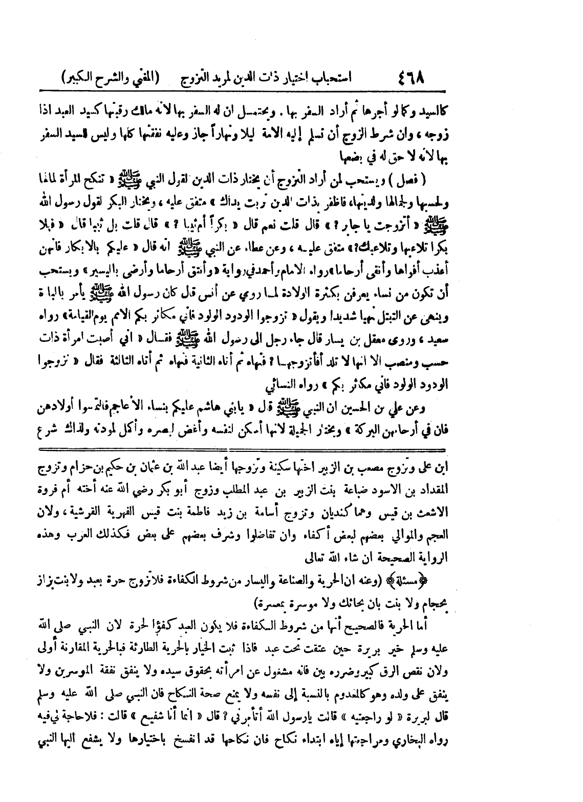 ابن علي وتزوج مصعب بن الزبير أختها سكينة وتزوجها أيضاً عبد الله بن عثمان بن حكيم بن حزام وتزوج المقداد بن الأسود ضباعة بنت الزبير بن عبد المطلب وزوج ابو بكر رضي الله عنه أخته أم فروة الأشعث بن قيس وهما كنديان وتزوج أسامة بن زيد فاطمة بنت قيس الفهرية القرشية، ولأن العجم والموالي بعضهم لبعض أكفاء وإن تفاضلوا وشرف بعضهم على بعض فكذلك العرب وهذه الرواية الصحيحة إن شاء الله تعالى (مسألة) (وعنه أن الحرية والصناعة واليسار من شروط الكفاءة فلا تزوج حرة بعبد ولا بنت بزاز بحجام ولا بنت بان بحائك ولا موسرة بمعسرة) أما الحرية فالصحيح أنها من شروط الكفاءة فلا يكون العبد كفؤا الحرة لأن النبي صلى الله عليه وسلم خير بريرة حين عتقت تحت عبد فإذا ثبت الخيار بالحرية الطارئة فبالحرية المقارنة أولى ولأن نقص الرق كبير وضرره بين فإنه مشغول عن امرأته بحقوق سيده ولا ينفق نفقة الموسرين ولا ينفق على ولده وهو كالمعدوم بالنسبة إلى نفسه ولا يمنع صحة النكاح فإن النبي صلى الله عليه وسلم قال لبريرة (لو راجعتيه) قالت يا رسول الله أتأمرني؟ قال (إنما أنا شفيع) قالت: فلا حاجة لي فيه رواه البخاري ومراجعتها إياه ابتداء نكاح فإن نكاحها قد انفسخ باختيارها ولا يشفع إليها النبي