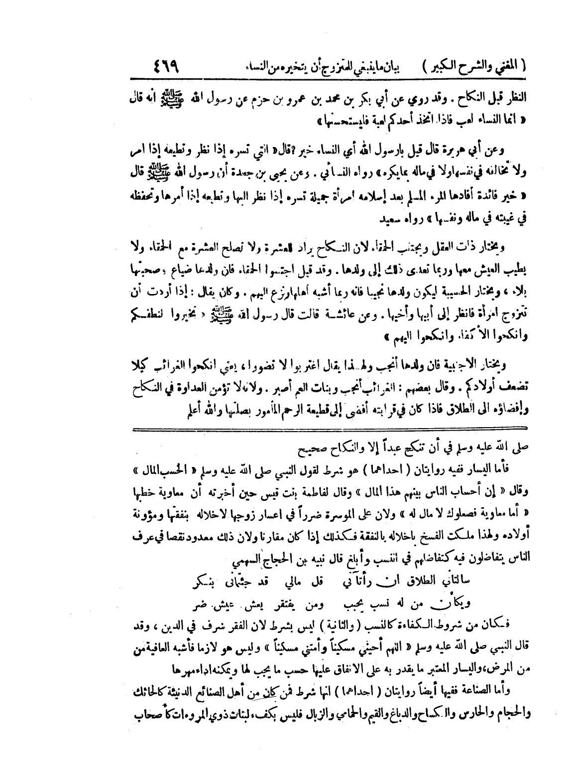 صلى الله عليه وسلم في أن تنكح عبداً إلا والنكاح صحيح فأما اليسار ففيه روايتان (إحداهما) هو شرط لقول النبي صلى الله عليه وسلم (الحسب المال) وقال (إن أحساب الناس بينهم هذا المال) وقال لفاطمة بنت قيس حين أخبرته أن معاوية خطبها (أما معاوية فصعلوك لا مال له) ولأن على الموسرة ضرراً في إعسار زوجها لإخلاله بنفقتها ومؤونة أولاده ولهذا ملكت الفسخ بإخلاله بالنفقة فكذلك إذا كان مقارنا ولأن ذلك معدود نقصاً في عرف الناس يتفاضلون فيه كتفاضلهم في النسب وأبلغ قال نبيه بن الحجاج السهمي * سألتاني الطلاق ان وأتاني * قال مالي قد جئتماني بنكر * * ويكأن من له نسب يحبب * ومن يفتقر يعيش عيش ضر * فكان من شروط الكفاءة كالنسب (والثانية) ليس بشرط لأن الفقر شرف في الدين، وقد قال النبي صلى الله عليه وسلم (اللهم أحيني مسكيناً وأمتني مسكيناً) وليس هو لازماً فأشبه العافية من من الرمض، واليسار المعتبر ما يقدر به على الأنفاق عليها حسب ما يجب لها ويمكنه أداء مهرها وأما الصناعة ففيها أيضاً روايتان (إحداهما) أنها شرط فمن كان من أهل الصنائع الدنيئة كالحائك والحجام والحارس والكساح والدباغ والقيم والحمامي والزبال فليس بكفء لبنات ذوي المرؤات كأصحاب