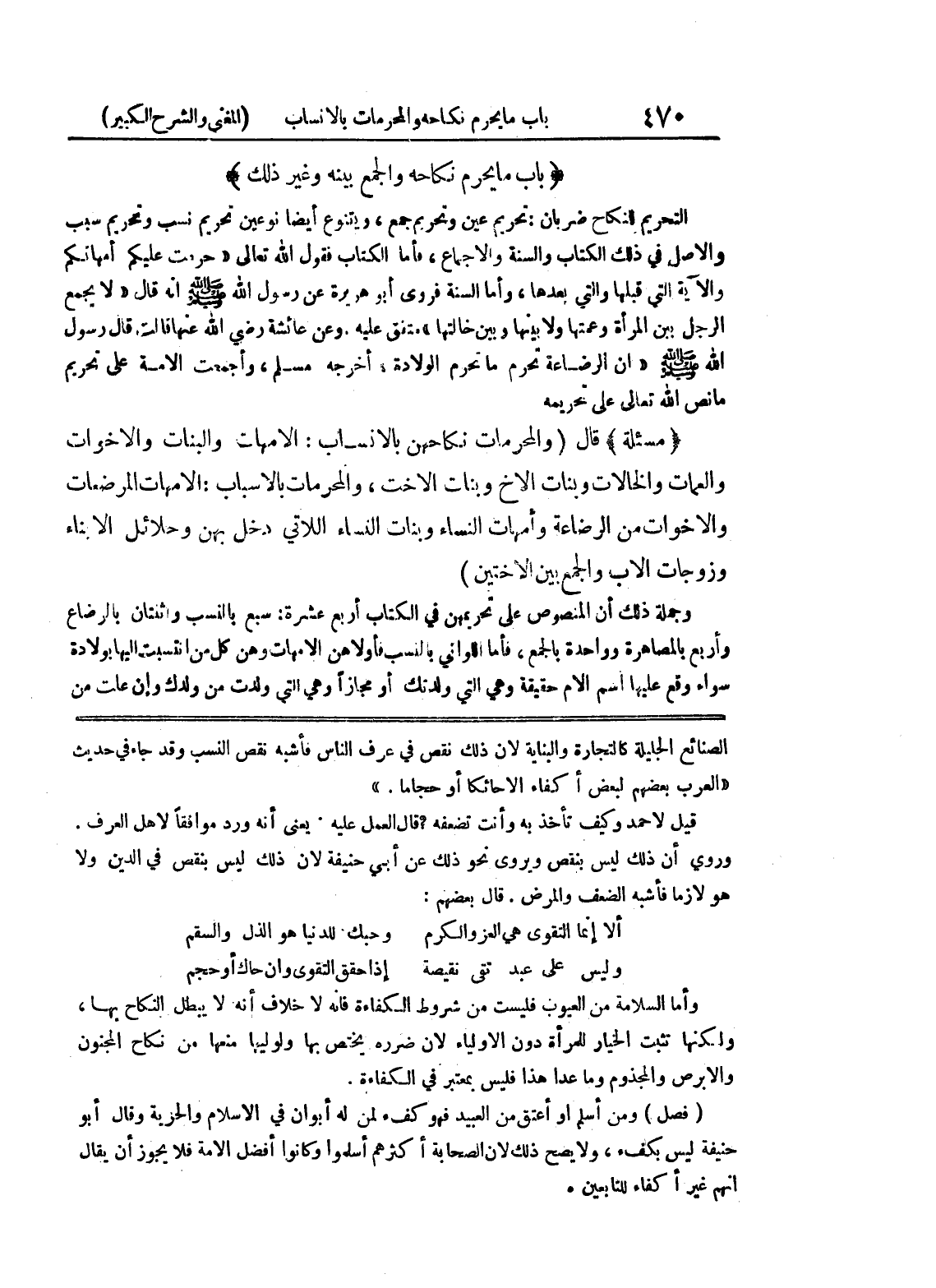 الصنائع الجليلة كالتجارة والبناية لأن ذلك نقص في عرف الناس فأشبه نقص النسب وقد جاء في حديث (العرب بعضهم لبعض أكفاء إلا حائكاً أو حجاما.