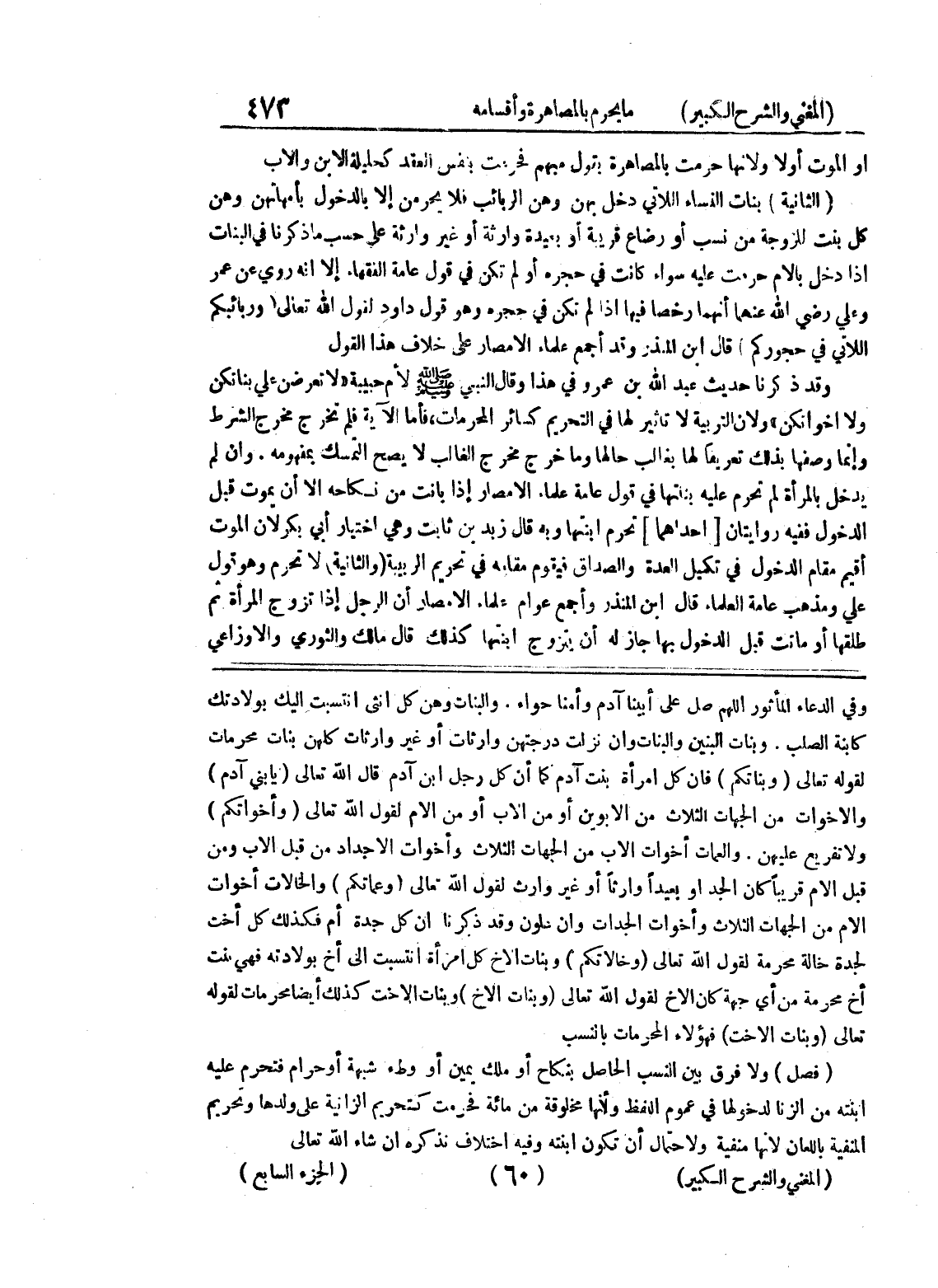 لجدة خالة محرمة لقول الله تعلاى (وخالاتكم) وبنات الأخ كل امرأة انتسبت إلى أخ بولادته فهي بنت أخ محرمة من أي جهة كان الأخ لقول الله تعالى (وبنات الأخ) وبنات الأخت كذلك أيضاً محرمات لقوله تعالى (وبنات الأخت) فهؤلاء المحرمات بالنسب (فصل) ولا فرق بين النسب الحاصل بنكاح أو ملك يمين أو وطئ شبهة أو حرام فتحرم عليه ابنته من الزنا لدخولها في عموم اللفظ ولأنها مخلوقة من مائه فحرمت كتحريم الزانية على ولدها وتحريم المنفية باللعان لأنها منفية ولاحتمال أن تكون ابنته وفيه اختلاف نذكره إن شاء الله تعالى