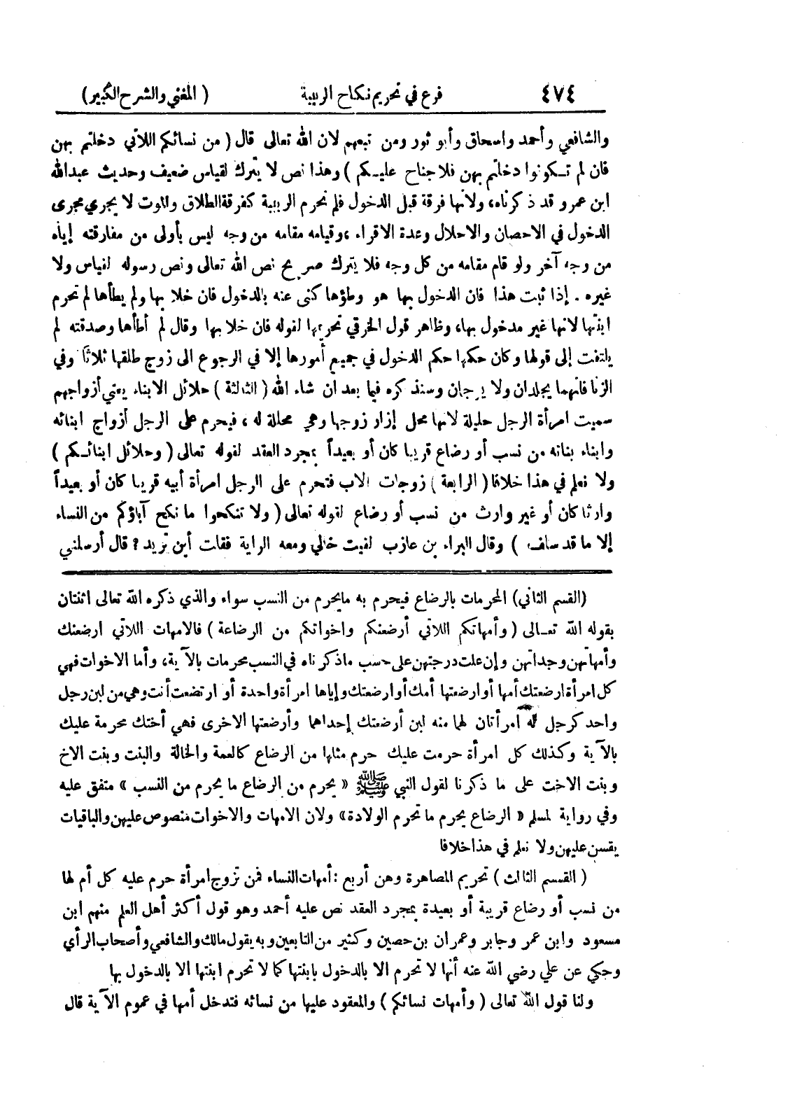 (القسم الثاني) المحرمات بالرضاع فيحرم به ما يحرم من النسب سواء والذي ذكره الله تعالى اثنتان بقوله الله تعالى (وأمهاتكم اللاتي أرضعنكم وأخواتكم من الرضاعة) فالأمهات اللاتي أرضعنك وأمهاتهن وجداتهن وإن علت درجتهن على حسب ما ذكرناه في النسب محرمات بالآية، وأما الأخوات فهي كل امرأة أرضعتك أمها أو أرضعتها أمك أو أرضعتك وإياها امرأة واحدة أو ارتضعت أنت وهي من لبن رجل واحد كرجل له امرأتان لها منه لبن أرضعتك إحداهما وأرضعتها الأخرى فهي أختك محرمة عليك بالآية وكذلك كل امرأة حرمت عليك حرم مثلها من الرضاع كالعمة والخالة والبنت وبنت الأخ وبنت الأخت على ما ذكرنا لقول النبي صلى الله عليه وسلم (يحرم من الرضاع ما يحرم من النسب) متفق عليه وفي رواية لمسلم (الرضاع يحرم ما تحرم الولادة) ولأن المهات والأخوات منصوص عليهن والباقيات يقسن عليهن ولا نعلم في هذا خلافا (القسم الثالث) تحريم المصاهرة وهن أربع: أمهات النساء فمن تزوج امرأة حرم عليه كل أم لها من نسب أو رضاع قريبة أو بعيدة بمجرد العقد نص عليه أحمد وهو قول أكثر أهل العلم منهم ابن مسعود وابن عمر وجابر وعمران بن حصين وكثير من التابعين وبه يقول مالك والشافعي وأصحاب الرأي وحكى عن علي رضي الله عنه أنها لا تحرم إلا بالدخول بابنتها كما لا تحرم ابنتها إلا بالدخول بها ولنا قول الله تعالى (وأمهات نسائكم) والمعقود عليها من نسائه فتدخل أمها في عموم الآية قال