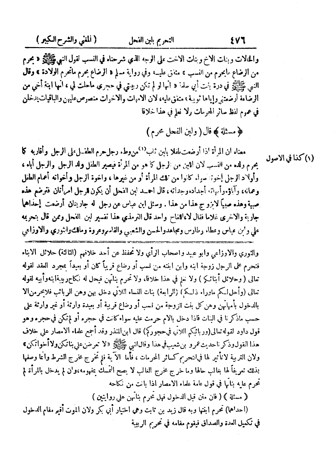 والثوري والاوزاعي وابو عبيد وأصحاب الرأي ولا تحفظ عن أحد خلافهم (الثالثة) حلائل الأبناء فتحرم على الرجل زوجة ابنه وابن ابنته من نسب أو رضاع قريباً كان أو بعيداً بمجردا العقد لقوله تعالى (وحلائل أبنائكم) ولا نعلم في هذه خلافاً، ولا تحرم بناتهن فيحل له نكاح ربيبة ابنه وأبيه لقوله تعالى (وأحل لكم ما وراء ذلكم) (الرباعة) بنات النساء اللاتي دخل بهن وهن الربائب فلا يحرمن إلا بالدخول بأمهاتهن وهن كل بنت للزوجة من نسب أو رضاع قريبة أو بعيدة وارثة أو غير وارثة على حسب ما ذكرنا في البنات فإذ دخل بالأم حرمت عليه سواء كانت في حجره أو لم تكن في حجره وهو قول داود لقوله تعالى (وربائبكم اللاتي في حجوركم) قال إبن المنذر وقد أجمع علماء الأمصار على خلاف هذا القول وذكرنا حديث عمرو بن شعيب في هذا وقال النبي صلى الله عليه وسلم (لا تعرضن علي بناتكن ولا أخواتكن)