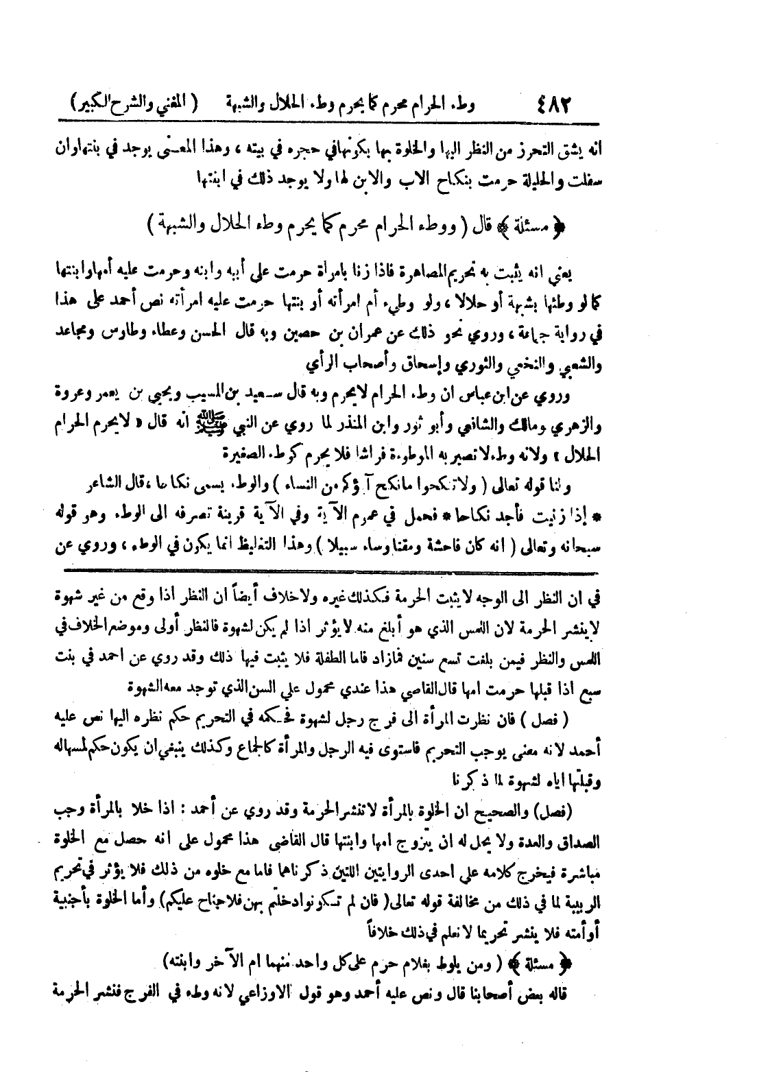 في أن النظر إلى الوجه لا يثبت الحرمة فكذلك غيره ولا خلاف أيضاً أن النظر إذا وقع من غير شهوة لا ينشر الحرمة لأن اللمس الذي هو أبلغ منه لا يؤثر إذا لم يكن لشهوة فالنظر أولى وموضع الخلاف في اللمس والنظر فيمن بلغت تسع سنين فما زاد فأما الطفلة فلا يثبت فيها ذلك وقد روي عن أحمد في بنت سبع إذا قبلها حرمت أمها قال القاضي هذا عندي محمول على السن الذي توجد معه الشهوة (فصل) فإن نظرت المرأة إلى فرج رجل لشهوة فحكمه في التحريم حكم نظره إليها نص عليه أحمد لأنه معنى يوجب التحريم فاستوى فيه الرجل والمرأة كالجماع وكذلك ينبغي أن يكون حكم لمسها له
