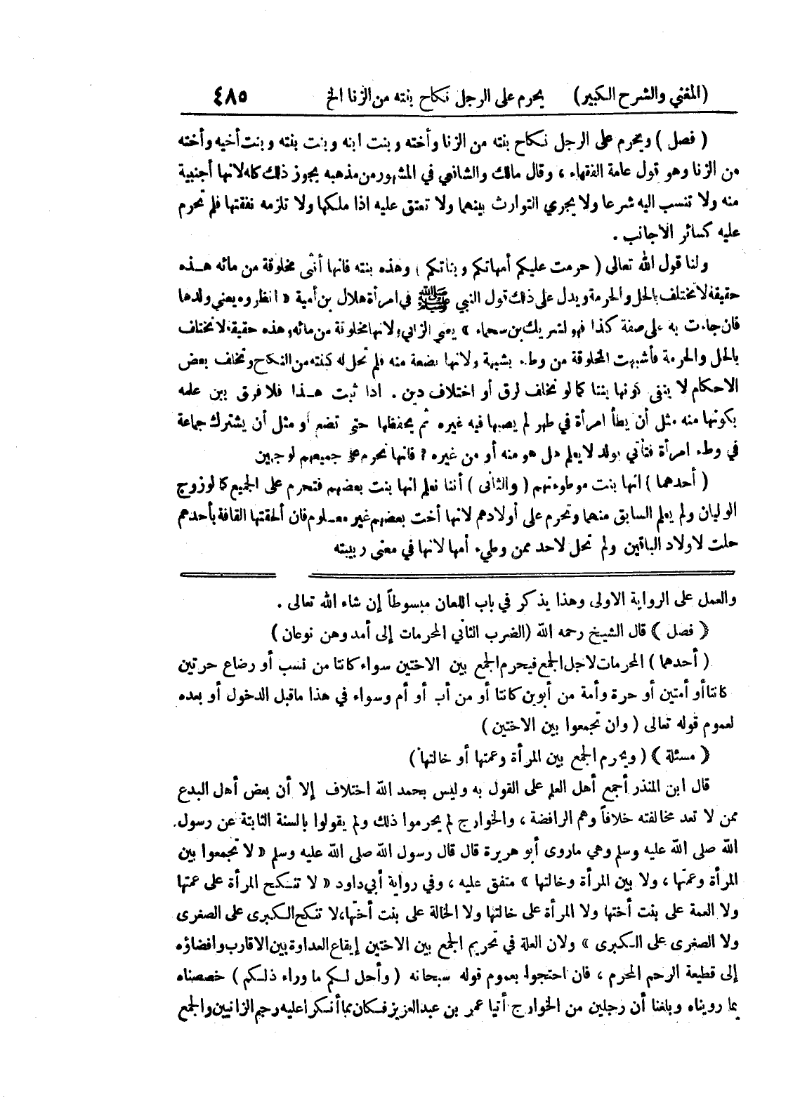 (فصل) قال الشيخ رحمه الله (الضرب الثاني المحرمات إلى آمد وهن نوعان) (أحدهما) المحرمات لاجل المع فيحرم الجمع بين الأختين سواء كانتا من نسب أو رضاع حرتين كانتا أو أمتين أو حرة وأمة من أبوين كانتا أو من أب أو أم وسواء في هذا ما قبل الدخول أو بعده لعموم قوله تعالى (وأن تجمعوا بين الأختين) (مسألة) (ويحرم الجمع بين المرأة وعمتها أو خالتها) قال إبن المنذر أجمع أهل العلم على القول به وليس بحمد الله اختلاف إلا أن بعض أهل البدع