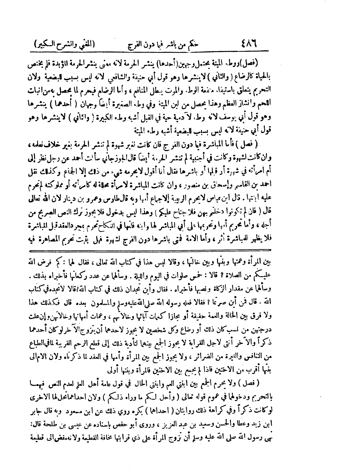 قال فمن أين صرتما؟ فقالا فعله رسوله الله صلى الله عليه وسلم والمسلمون بعده قال فكذلك هذا ولا فرق بين الحالة والعمة حقيقة أو مجازاً كعمات آبائها وخالاتهم، وعمات أمهاتها وخالاتهن وإن علت درجتهن من نسب كان ذلك أو رضاع وكل شخصين لا يجوز لأحدهما أن يتزوج الآخر لو كان أحدهما ذكراً والآخر أنثى لأجل القرابة لا يجوز الجمع بينهما لتأدية ذلك إلى قطع الرحم القريبة لما في الطباع من التنافس والغيرة من الضرائر، ولا يجوز الجمع بين المرأة وأمها في العقد لما ذكرناه ولأن الأم إلى بنتها أقرب من الأختين فإذا لم يجمع بنى الأختين فالمرأة وبنتها أولى (فصل) ولا يحرم الجمع بين ابنتي الخال في قول عامة أهل العم لعدم النص فيهما بالتحريم ودخولهما في عموم قوله تعالى (وأحل لكم ما وراء ذلكم) ولأن إحداهما تحل لها الأخرى لو كانت ذكراً وفي كراهة ذلك روايتان (إحداهما) يكره روى ذلك عن ابن مسعود وبه قال جابر ابن زيد وعطا والحسن وسعيد بن عبد العزيز، وروي أبو حفص بإسناده عن عيسى بن طلحة قال: نهى رسول الله صلى الله عليه وسلم أن تزوج المرأة على ذي قرابتها مخافة القطيعة ولأنه مفض إلى قطيعة
