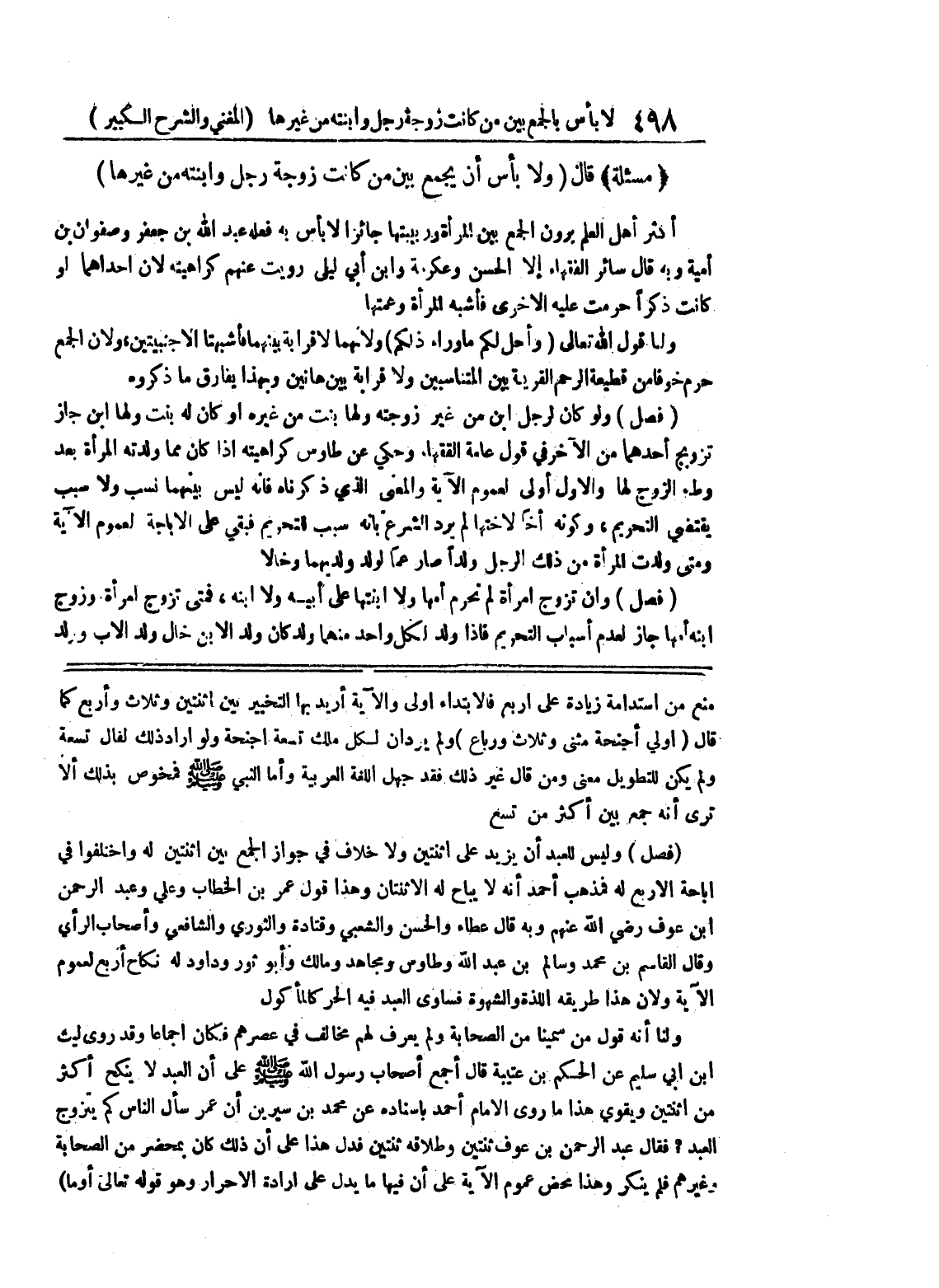 منع من استدامة زيادة على أربع فالابتداء أولى والآية أريد بها التخيير بين اثنتين وثلاث وأربع كما قال (أولي أجنحة مثنى وثلاث ورباع) ولم يردان لكل ملك تسعة أجنحة ولو أراد ذلك لقال تسعة ولم يكن للتطويل معنى ومن قال غير ذلك فقد جهل اللغة العربية وأما النبي صلى الله عليه وسلم فمخوص بذلك ألا ترى أنه جمع بين أكثر من تسع (فصل) وليس للعبد أن يزيد على اثنتين ولا خلاف في جواز الجمع بين اثنتين له واختلفوا في إباحة الأربع له فمذهب أحمد أنه لا يباح له الاثنتان وهذا قول عمر بن الخطاب وعلي وعبد الرحمن ابن عوف رضي الله عنهم وبه قال عطاء والحسن والشعبي وقتادة والثوري والشافعي وأصحاب الرأي وقال القاسم بن محمد وسالم بن عبد الله وطاوس ومجاهد ومالك وأبو ثور وداود له نكاح أربع لعموم الآية ولأن هذا طريقه اللذة والشهوة فساوى العبد فيه الحر كالمأكول ولنا أنه قول من سمينا من الصحابة ولم يرعف لهم مخالف في عصرهم فكان إجماعاً وقد روى ليث ابن أبي سليم عن الحكم بن عتبية قال أجمع أصحاب رسول الله صلى الله عليه وسلم على أن العبد لا ينكح أكثر من اثنتين ويقوي هذا ما روي الإمام أحمد بإسناده عن محمد بن سيرين أن عمر سأل الناس كم يتزوج العبدء فقال عبد الرحمن بن عوف ثنتين وطلاقه ثنتين فدل هذا على أن ذلك كان بمحضر من الصحابة وغيرهم فلم ينكر وهذا محض عموم الآية على أن فيها ما يدل على إرادة الأحرار وهو قوله تعالى أو ما)