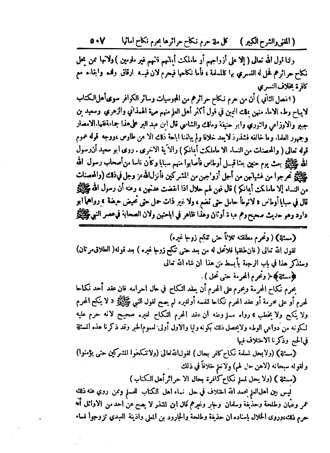 (مسألة) (وتحرم مطلقته ثلاثاً حتى تنكح زوجا غيره) لقول الله تعالى (فإن طلقها فلا تحل له من بعد حتى تنكح زوجاً غيره) بعد قوله (الطلاق مرتان) وسنذكر هذا في باب الرجعة بأبسط من هذا إن شاء الله تعالى (مسألة) (وتحرم المحرمة حتى تحل) يحرم نكاح المحرمة ويحرم على المحرم أن يعقد النكاح في حال إحرامه فإن عقد أحد نكاحها لمحرم أو على محرمة أو عقد المحرم نكاحاً لنفسه أو لغيره لم يصح لقول النبي صلى الله عليه وسلم (لا ينكح المحرم ولا ينكح ولا يخطب) رواه مسلم وعنه أن عقد المحرم النكاح لغيره صحيح لأنه حرم عليه لكونه من دواعي الوطئ ولا يحصل ذلك بكونه وليا والأول أولى لعموم الخبر وقد ذكرنا هذه المسألة في الحج وذكرنا الاختلاف فيها (مسألة) (ولا يحل لمسلمة نكاح كافر بحال) لقول الله تعالى (ولا تنكحوا المشركين حتى يؤمنوا) ولقوله سبحانه (لا هن حل لهم) ولا نعلم خلافاً في ذلك.
