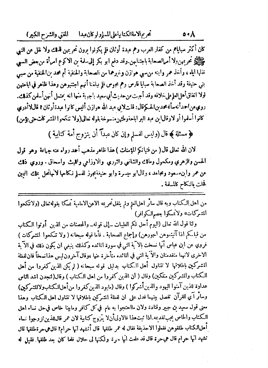 فأما قول سبحانه (ولا تنكحوا المشركات) فروي عن ابن عباس أنها نسخت بالآية التي في سورة المائدة وكذلك ينبغي أن يكون ذلك في الآية الأخرى لأنهما متقدمتان والآية التي في المائدة متأخرة عنها، وقال آخرون ليس هذا نسخاً فإن لفظة المشركين بإطلاقها لا تتناول أهل الكتاب بدليل قوله سبحانه (لم يكن الذين كفروا من أهل الكتاب والمشركين منفكين) وقال (إن الذين كفروا من أهل الكتاب) وقال (لتجدن أشد الناس عداوة للذين آمنوا اليهود والذين أشركوا) وقال (ما يود الذين كفروا من أهل الكتاب ولا المشركين) وسائر آي القرآن تفصل بينهما فدل على أن لفظة المشركين بإطلاقها لا تتناول أهل الكتاب وهذا معنى قول سعيد بن جبير وقتادة ولأن ما احتجوا به عام في كل كافر وما بينا خاص في حل نساء أهل الكتاب والخاص يجب تقديمه إذا ثبت هذا فالأولى أن لا يتزوج كتابية لأن عمر قال للذين تزوجوا نساء أهل الكتاب طلقوهن ففعلوا إلا حذيفة فقال له عمر طلقها قال أتشهد أنها حرام؟ قال هي حرة طلقها قال تشهد أنها حرام قال هي حرة قال قد علمت أنها حرة ولكنها لي حلال فلما كان بعد طلقها فقيل له