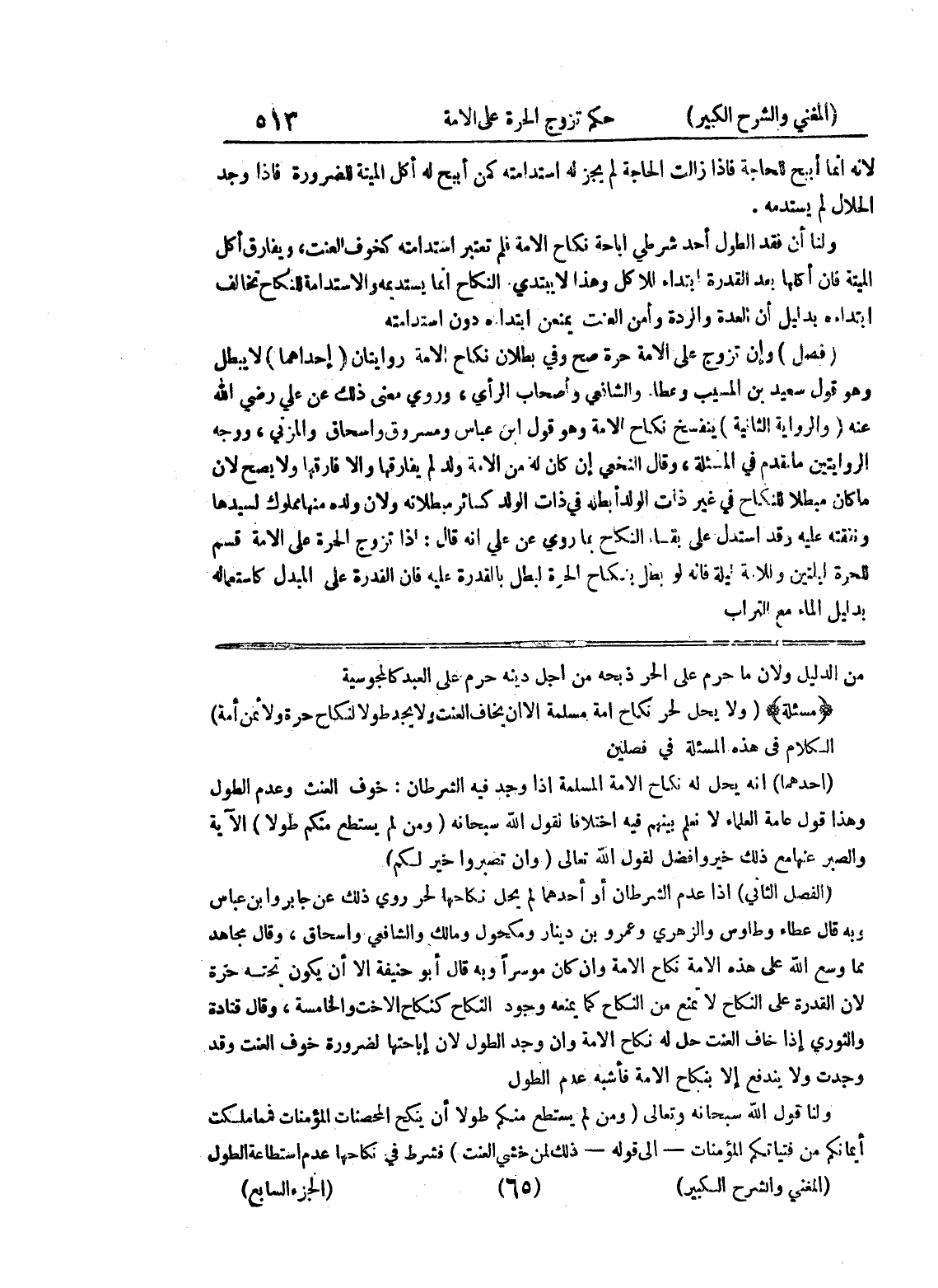 من الدليل ولأن ما حرم على الحرد ذبحه من أجل دينه حرم على العبد كالمجوسية (مسألة) (ولا يحل لحر نكاح أمة مسلمة إلا أن يخاف العنت ولا يجد طولا لنكاح حرة ولا ثمن أمة) الكلام في هذا المسألة في فصلين (احداهما) أنه يحل له نكاح الأمة المسلمة إذا وجد فيه الشرطان: خوف العنث وعدم الطول وهذا قول عامة العلماء لا نعلم بينهم فيه اختلافا لقول الله سبحانه (ومن لم يستطع منكم طولا) الآية والصبر عنها مع ذلك خير وأفضل لقول الله تعالى (وإن تصبروا خير لكم) (الفصل الثاني) إذا عدم الشرطان أو أحدهما لم يحل نكاحها لحر روى ذلك عن جابر وابن عباس وبه قال عطاء وطاوس والزهري وعمرو بن دينار ومكحول ومالك والشافعي واسحاق، وقال مجاهد مما وسع الله على هذه الأمة نكاح الأمة وإن كان موسراً وبه قال أبو حنيفة إلا أن يكون تحته حرة لأن القدرة على النكاح لا تمنع من النكاح كما يمنعه وجود النكاح كنكاح الأخت والخامسة، وقال قتادة والثوري إذا خاف العنت حل له نكاح الأمة وإن وجد الطول لأن إباحتها لضرورة خوف العنت وقد وجدت ولا يندفع إلا بنكاح الأمة فأشبه عدم الطول ولنا قول الله سبحانه وتعالى (ومن سلم يستطع منكم طولا أن ينكح المحصنات المؤمنات فمما ملكت أيمانكم من فتياتكم المؤمنات - إلى قوله - ذلك لمن خشي العنت) فشرط في نكاحها عدم استطاعة الطول