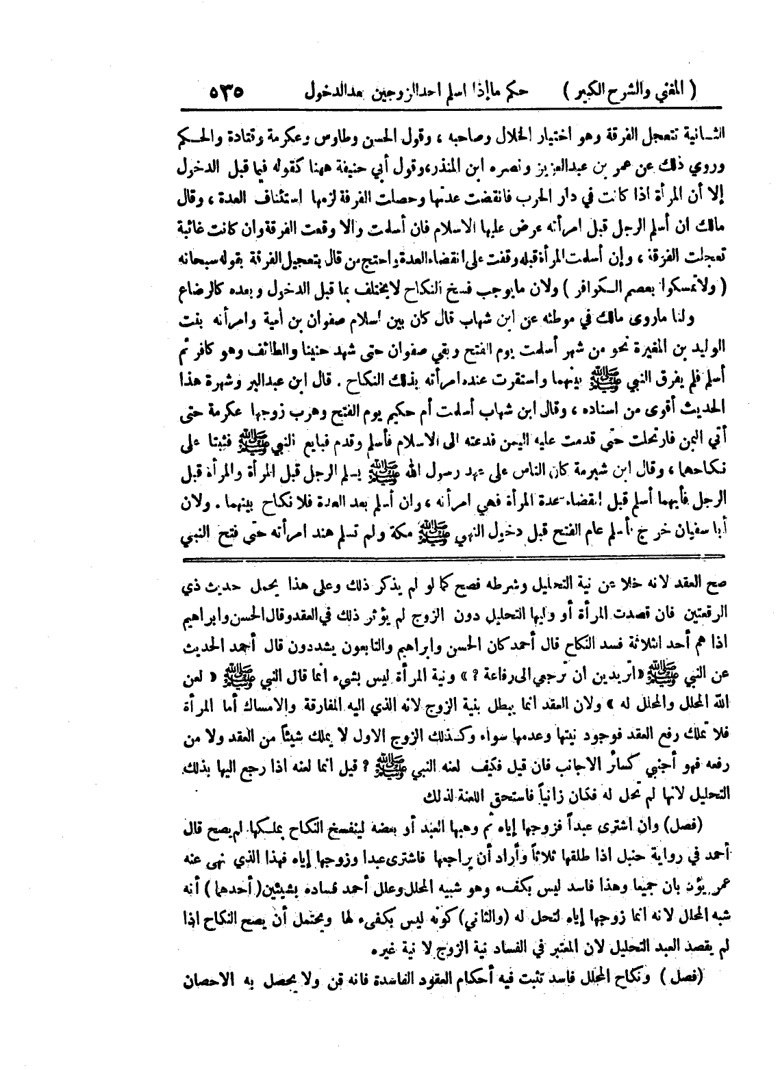(فصل) وإن اشترى عبداً فزوجها إياه ثم وهبها العبد أو بعضه لينفسخ النكاح يملكها لم يصح قال أحمد في رواية حنبل إذا طلقها ثلاثاً وأراد أن يراجعها فاشترى عبداً وزوجها إياه فهذا الذي نهى عنه عمر يؤذبان جميعاً وهذا فاسد ليس بكفء وهو شبيه المحلل وعلل أحمد فساده بشيئين (أحدهما) أنه شبه المحلل لأنه إنما زوجها إياه لتحل له (والثاني) كونه ليس بكفئ لها ويحتمل أن يصح النكاح إذا لم يقصد العبد التحليل لأن المعتبر في الفساد نية الزوج لانية غيره (فصل) ونكاح المحلل فاسد تثبت فيه أحكام العقود الفاسدة فإنه قن ولا يحصل به الإحصان