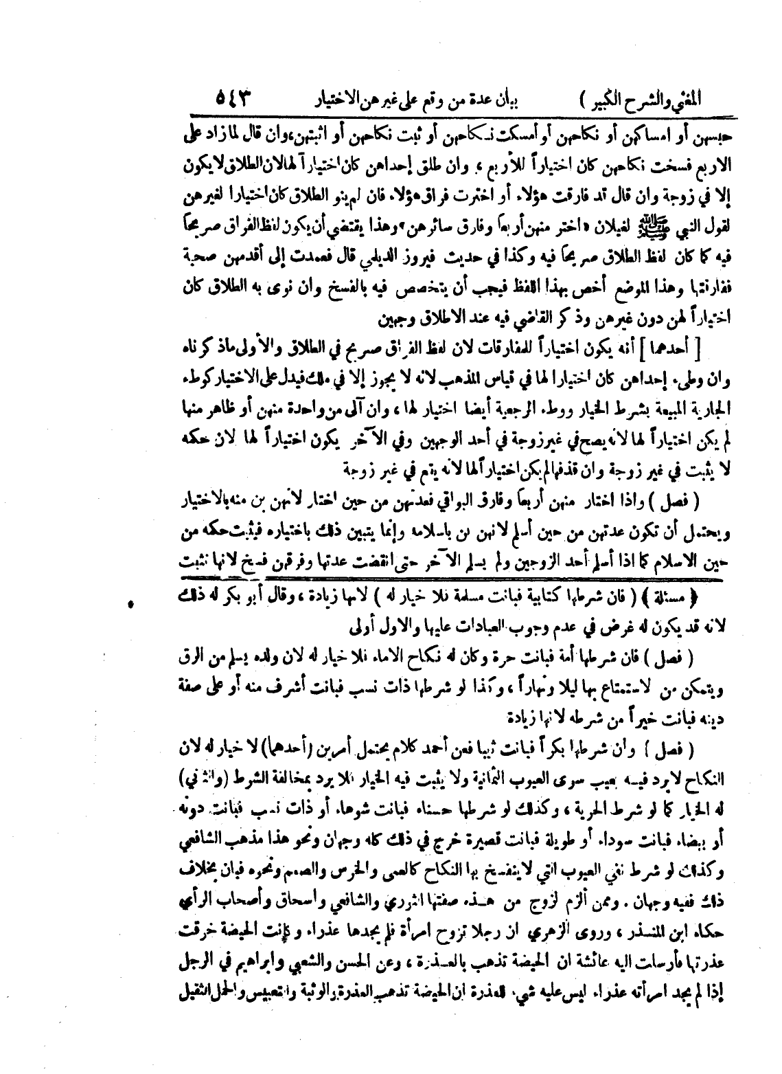 (مسألة) (فإن شرطها كتابية فبانت مسلمة فلا خيار له) لأنها زيادة، وقال أبو بكر له ذلك لأنه قد يكون له غرض في عدم وجوب العبادات عليها والأول أولى (فصل) فإن شرطها أمة فبانت حرة وكان له نكاح الإماء فلا خيار له لأن ولده يسلم من الرق ويتمكن من لاستمتاع بها ليلاً ونهاراً، وكذا لو شرطها ذات نسب فبانت أشرف منه أو على صفة دينه فبانت خيراً من شرطه لأنها زيادة (فصل) وإن شرطها بكراً فبانت ثيباً فعن أحمد كلام يحتمل أمرين (أحدهما) لا خيار له لأن النكاح لا يرد فيه بعيب سوى العيوب الثمانية ولا يثبت فيه الخيار فلا يرد بمخالفة الشرط (والثاني) له الخيار كما لو شرط الحرية، وكذلك لو شرطها حسناء فبانت شوهاء أو ذات نسب فبانت دونه أو بيضاء فبانت سوداء أو طويلة فبانت قصيرة خرج في ذلك كله وجهان ونحو هذا مذهب الشافعي وكذلك لو شرط نفي العيوب التي لا ينفسخ بها النكاح كالعمى والخرس والصمم ونحو فبان بخلاف ذلك ففيه وجهان.