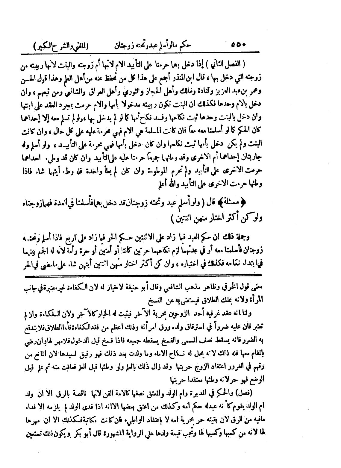 بالمقام معها فله ذلك لأنه يحل له نكاح الإماء وما ولدت بعد ذلك فهو رقيق لسيدها لأن المانع من رقهم في الغرور اعتقاد الزوج حريتها وقد زال ذلك بالعلم ولو وطئها قبل العلم فعلقت منه ثم علم قبل الوضع فهو حر لأنه وطئها معتقداً حريتها (فصل) والحكم في المدبرة وأم الولد والمعتق نصفها كالأمة القن لأنها ناقصة بالرق إلا أن ولد أم الولد يقوم كأنه عبد له حكم أمه وكذلك من أعتق بعضها إلا أنه إذا فدى الولد لم يلزمه الافداء ما فيه من الرق لأن بقيته حر بحرية أمه لا باعتقاد الواطئ فإن كانت مكاتبة فكذلك إلا أن مهرها لها لأنه من كسبها وكسبها لها وتجب قيمة ولدها على الرواية المشهورة قال أبو بكر ويكون ذلك تستعين